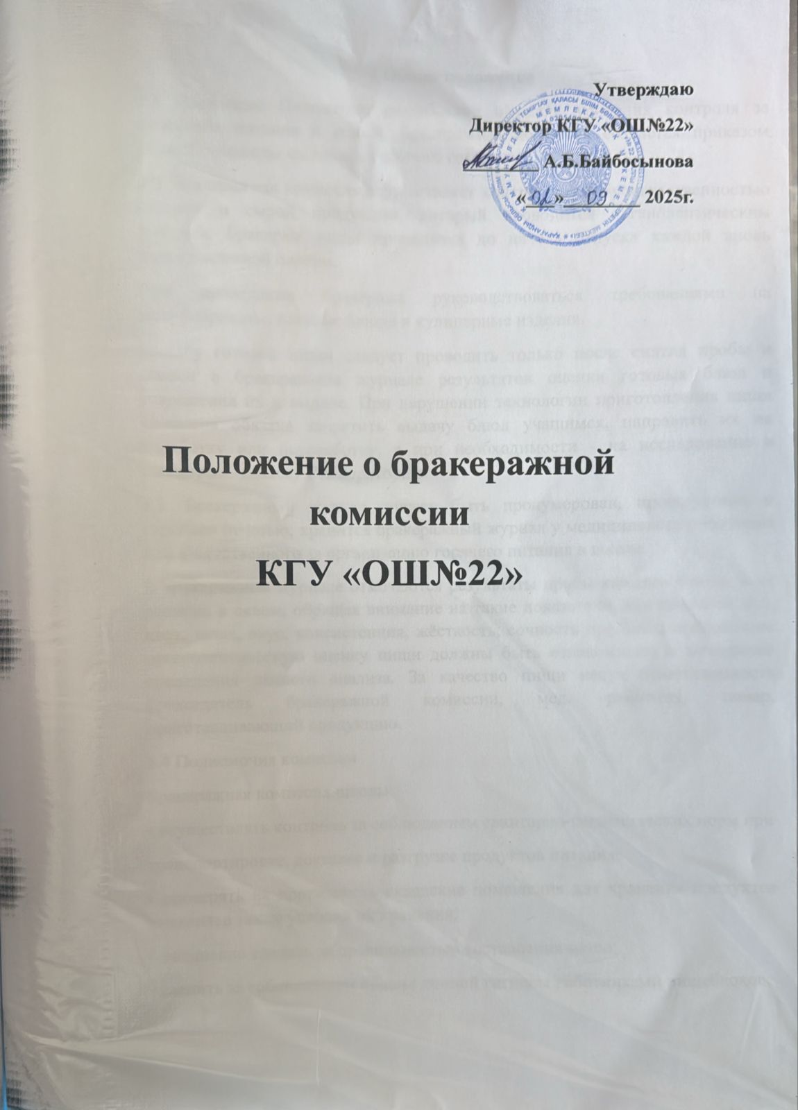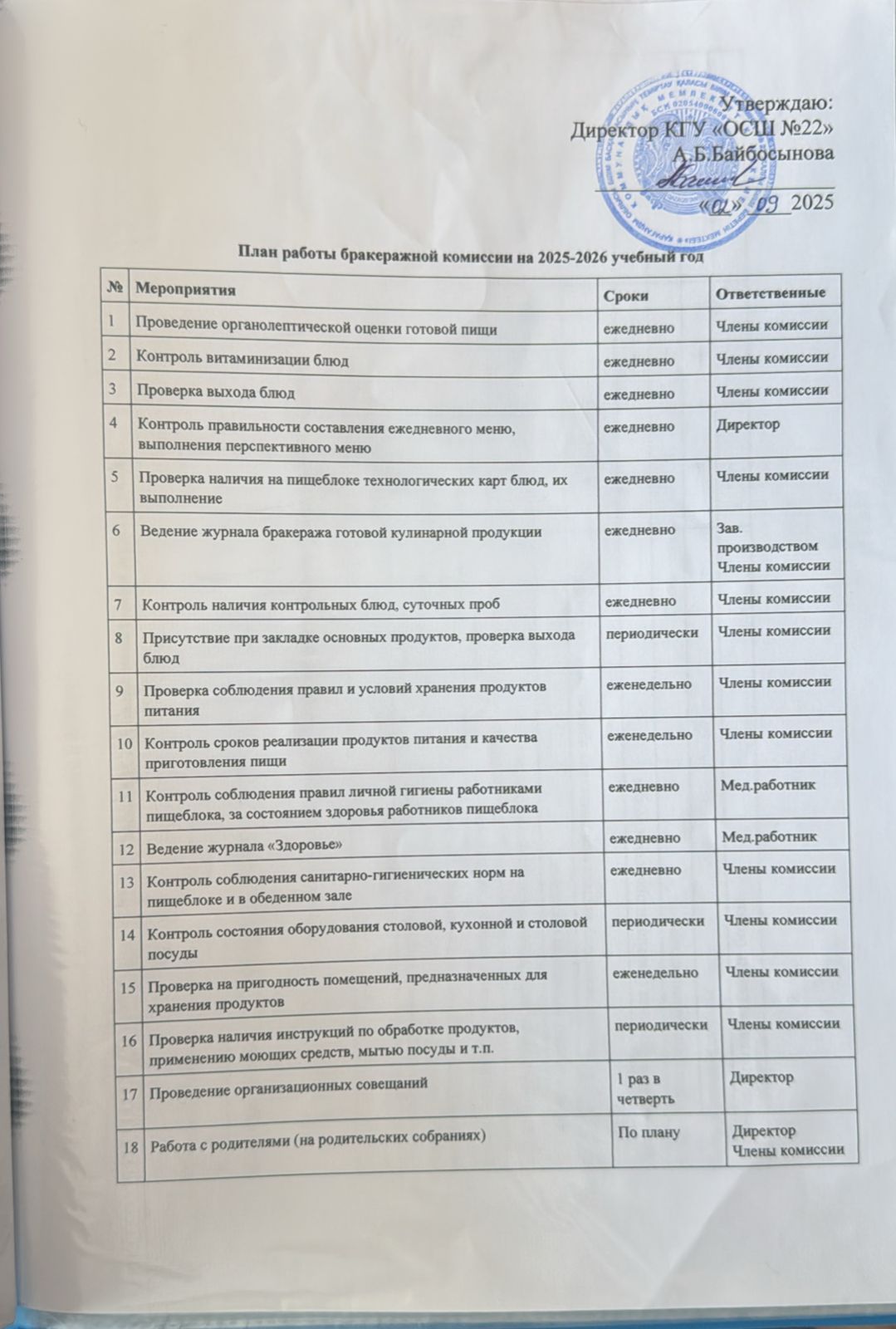 План работыо бракеражной комисии на 2025-2026 учебный год КГУ ОШ 22
