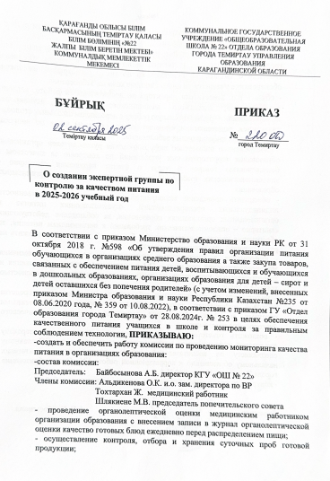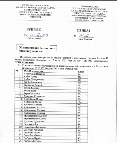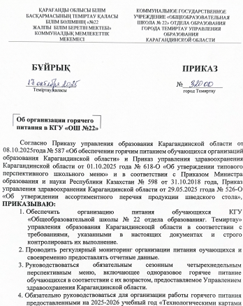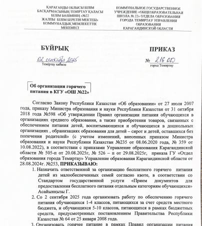 Согласно Приказу управления образования Карагандинской области от 08.10.2025года № 587 «Об обеспечении горячим питанием обучающихся организаций образования Карагандинской области» и Прик…