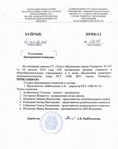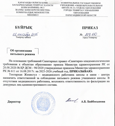 На основании приказа ГУ «Отдел образования города Темиртау» № 253 от 28 августа 2024 года «Об организации питания учащихся в общеобразовательных учреждениях» и в целях обеспе…