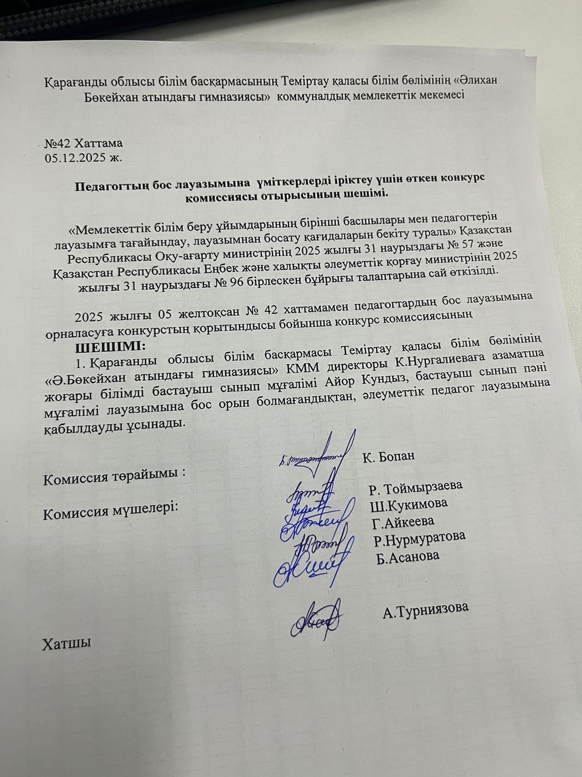 Педагогтың бос лауазымына үміткерлерді іріктеу үшін өткен конкурс комиссиясы отырысының шешімі. 06.11.2025