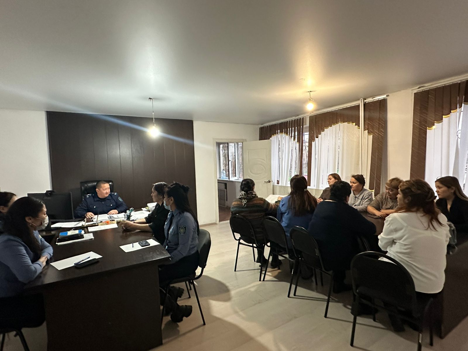Шахтинск қаласы полиция бөлімінің жергілікті полиция қызметі бөлімінің ювеналды полиция тобының учаскелік полиция инспекторы полиция лейтенанты Төлеужан Назым Қойшыбайқызы әлеуметтік педагог Л.Р.Буг…