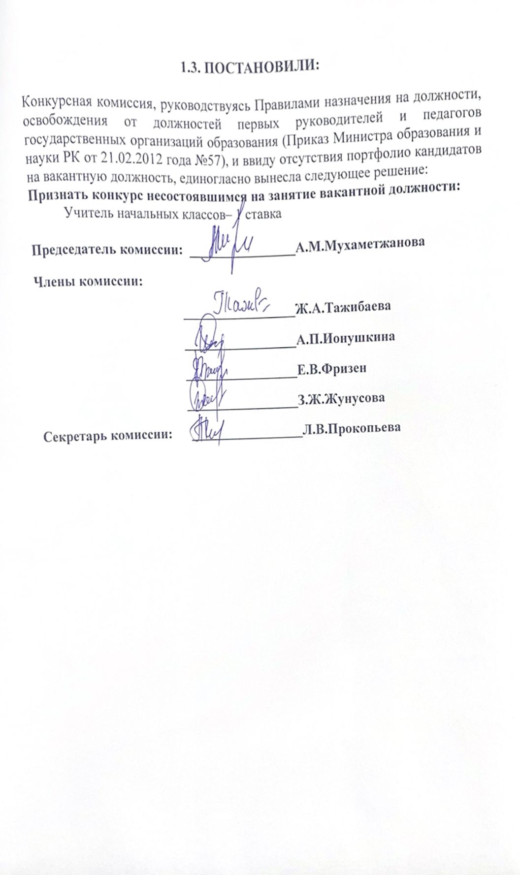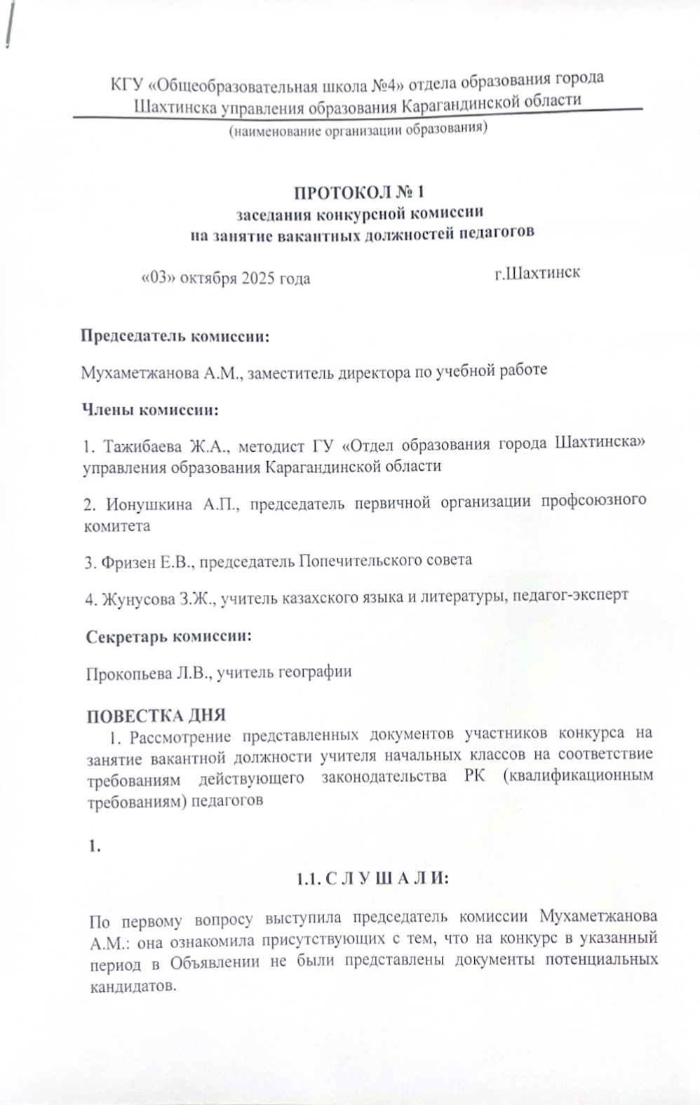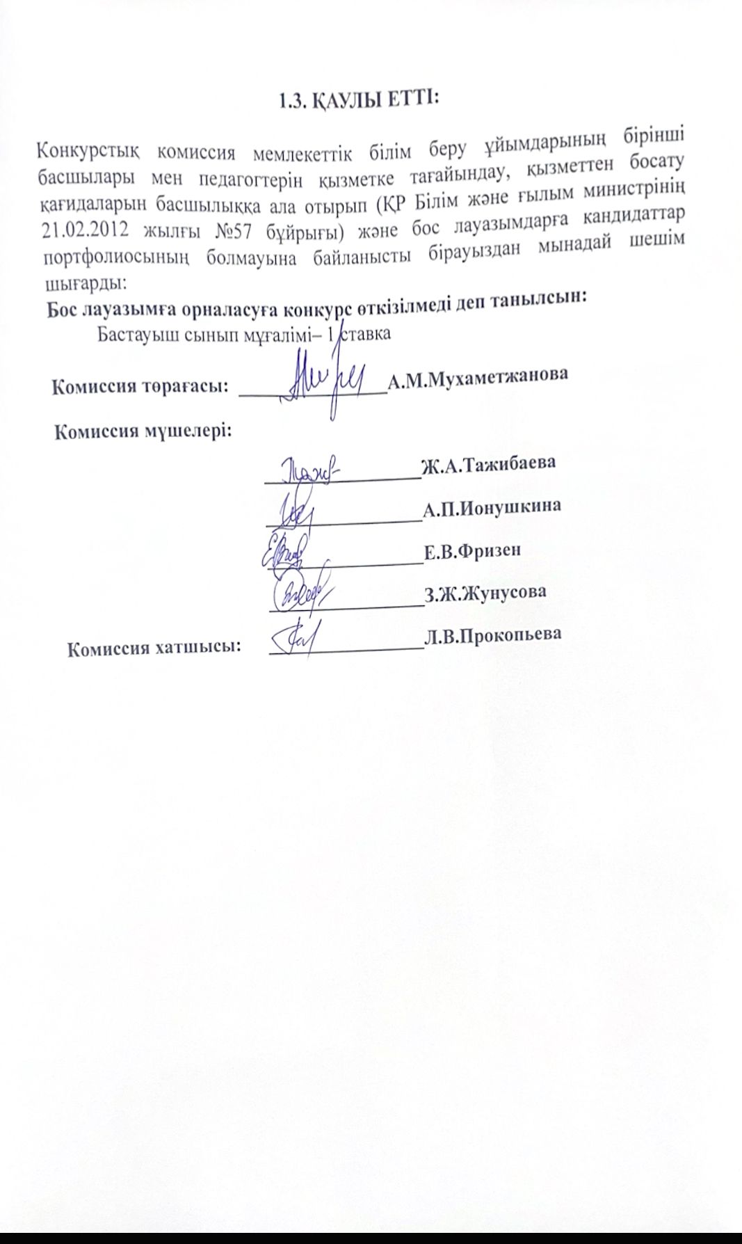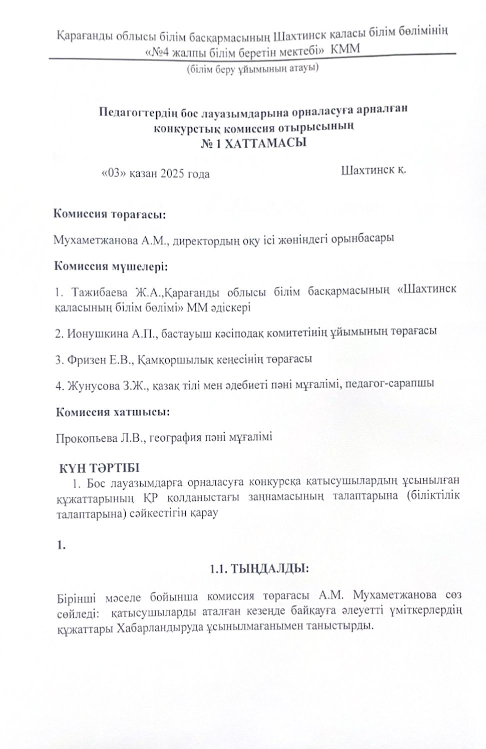 Педагог қызметкерлердің бос лауазымдарына орналасуға арналған конкурстық комиссия отырысының