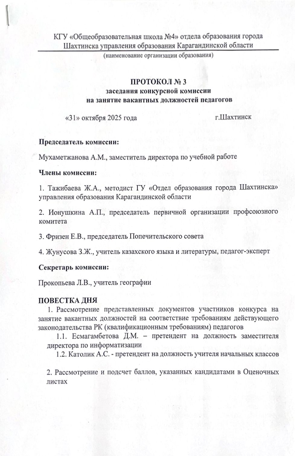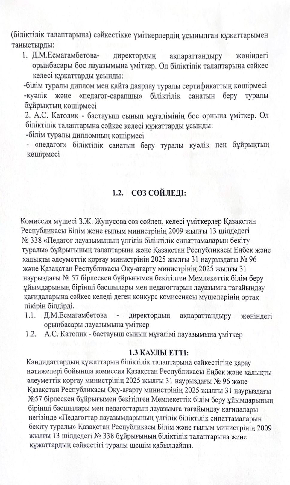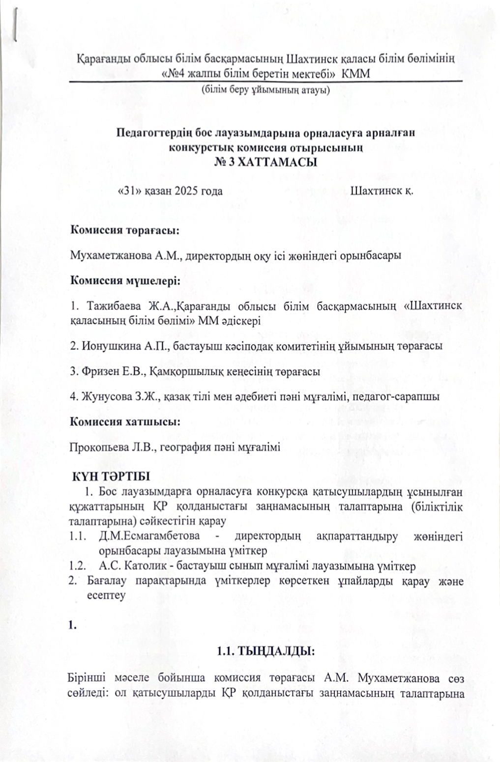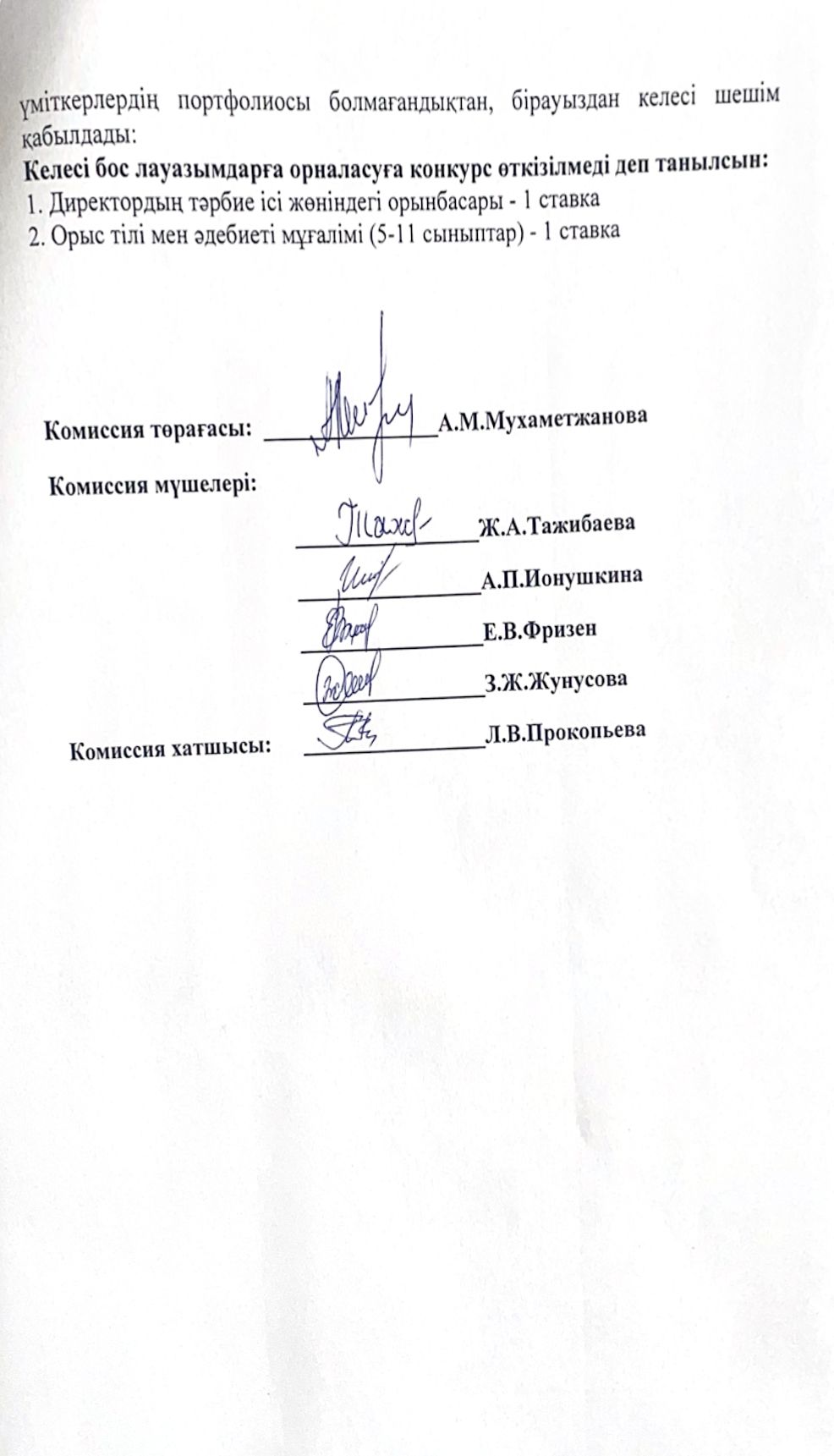 Педагогтердің бос лауазымдарына орналасуға арналған конкурстық комиссия отырысының