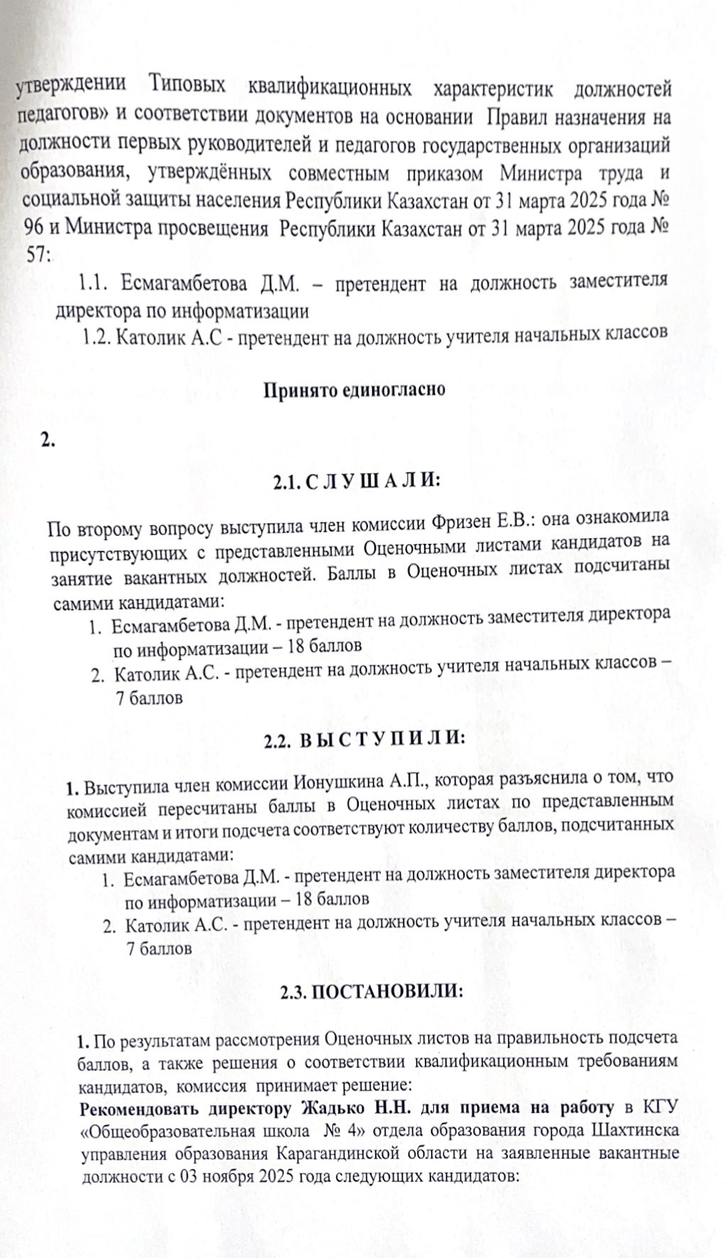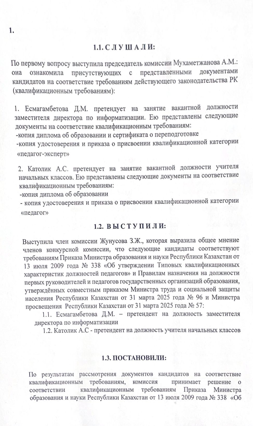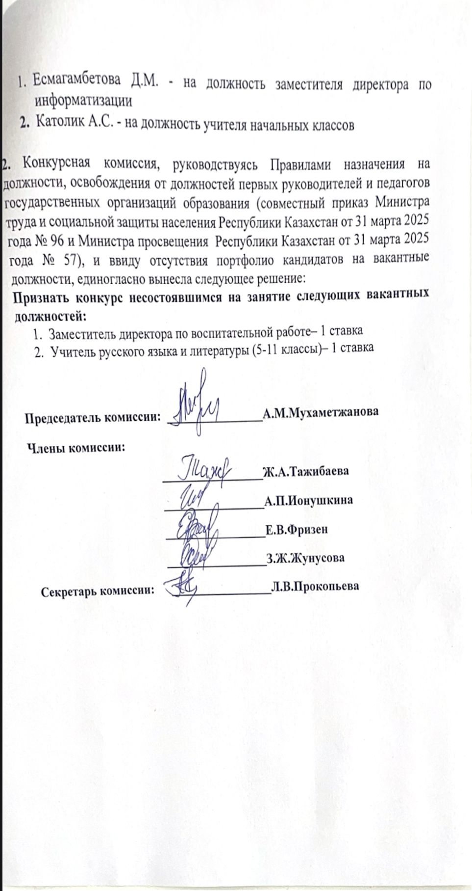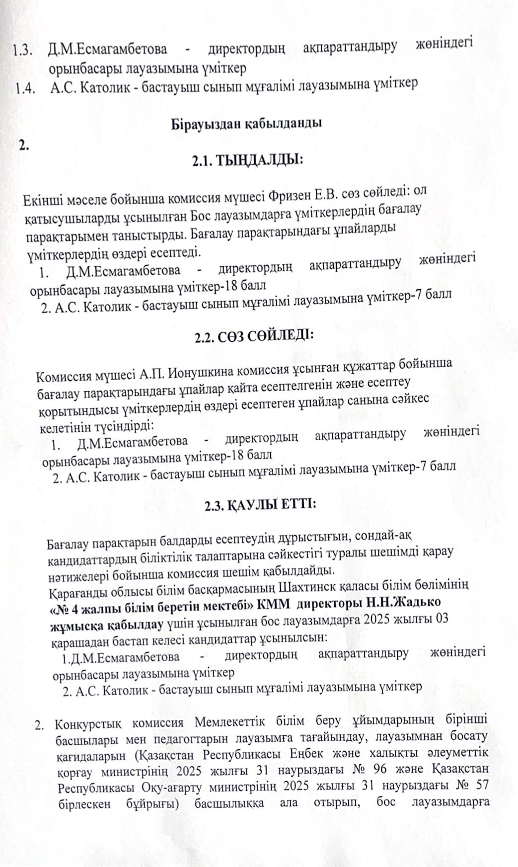 Педагогтердің бос лауазымдарына орналасуға арналған конкурстық комиссия отырысының
