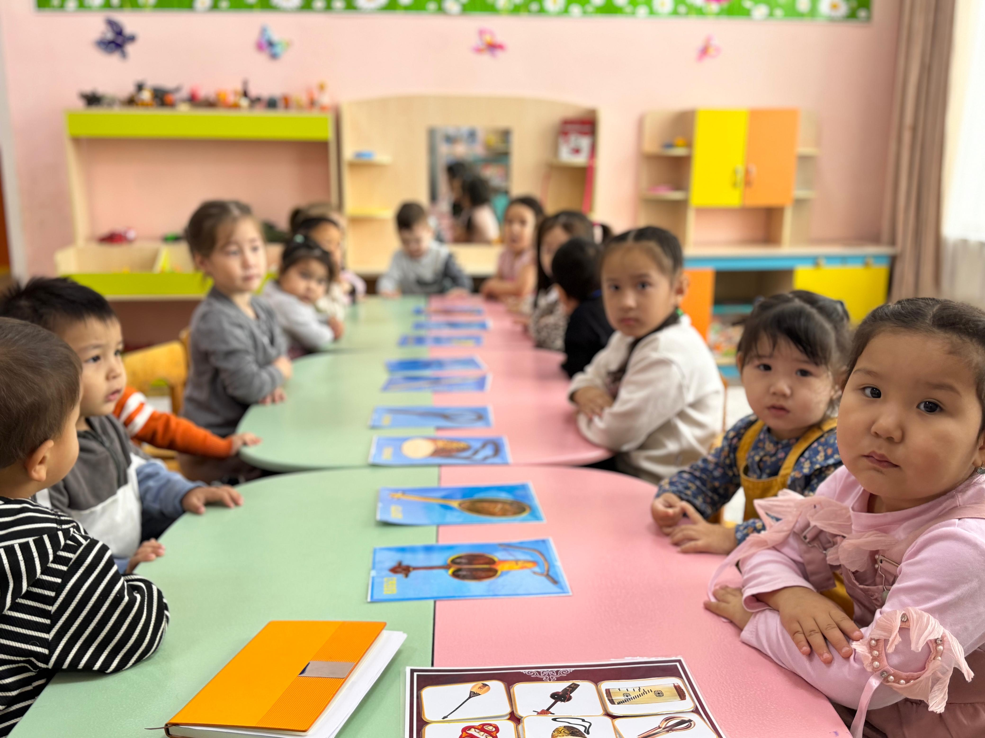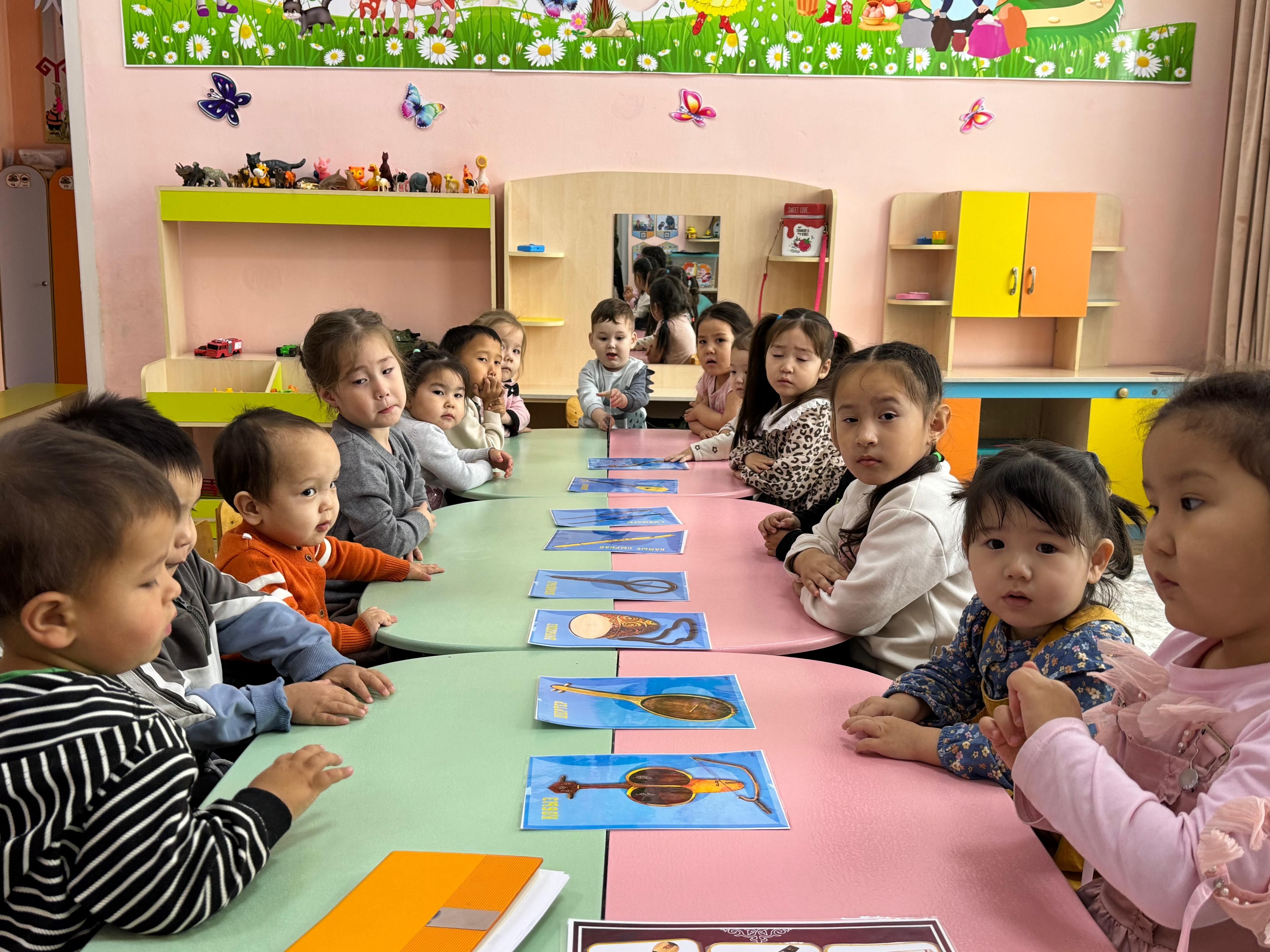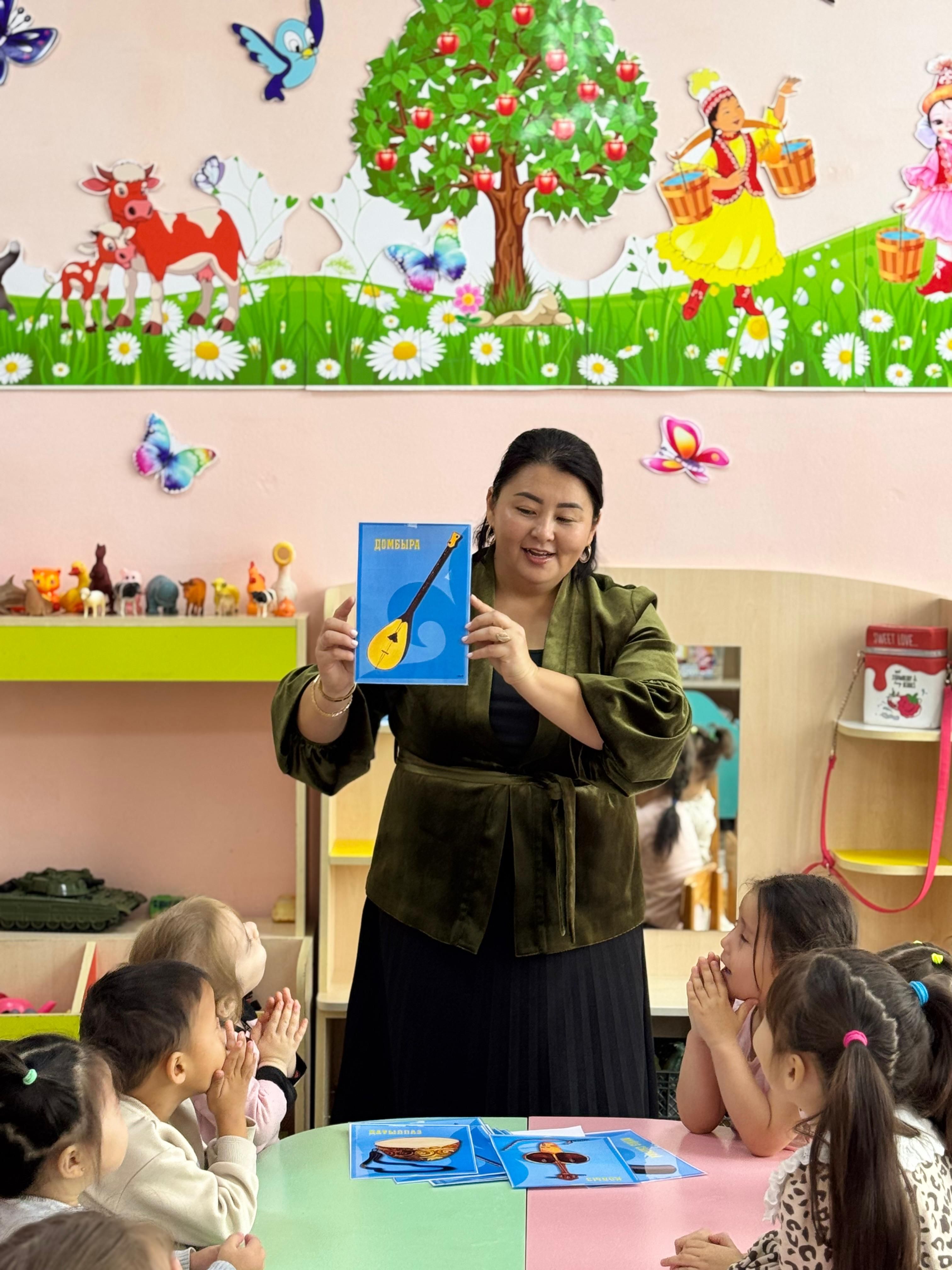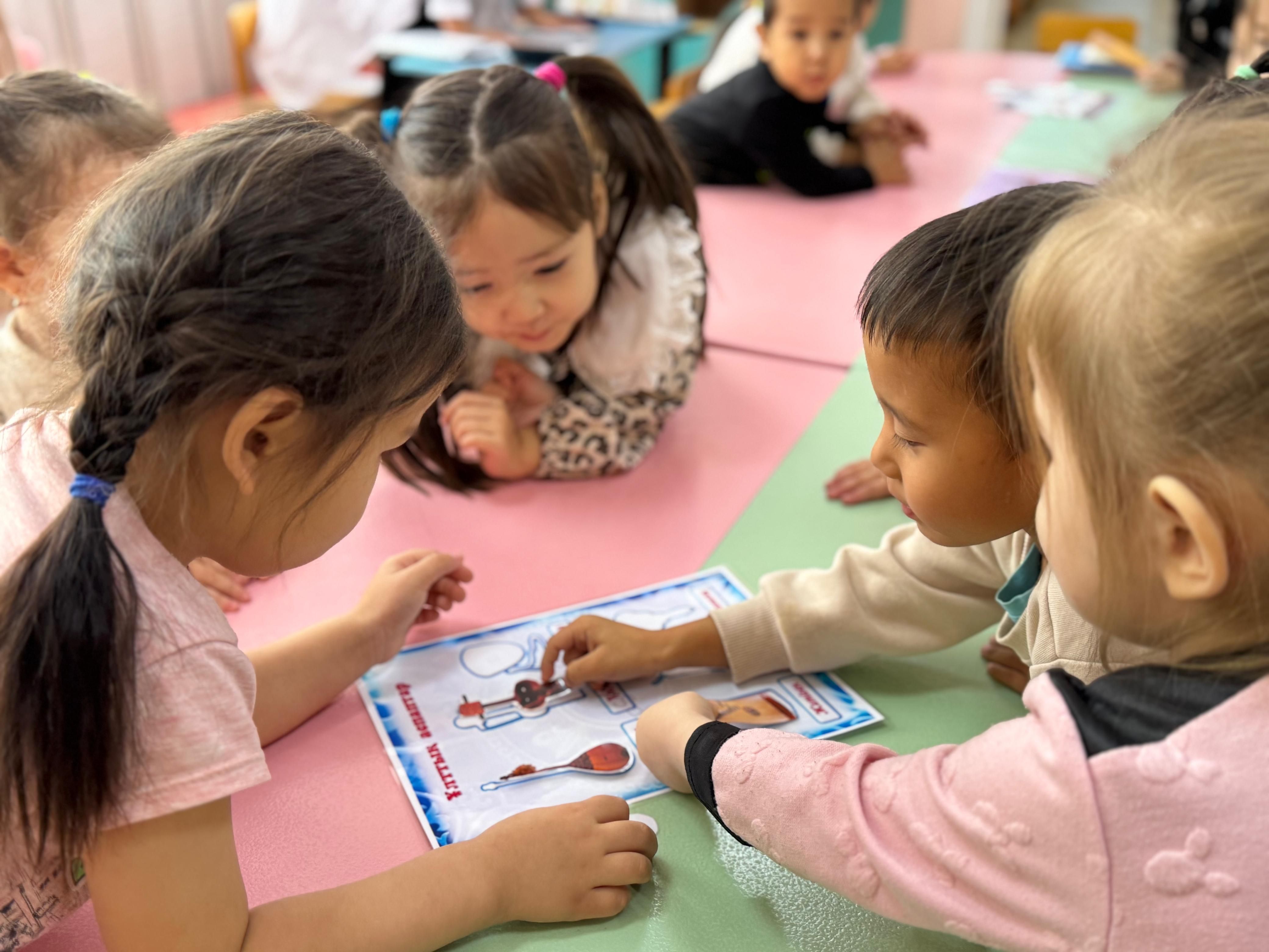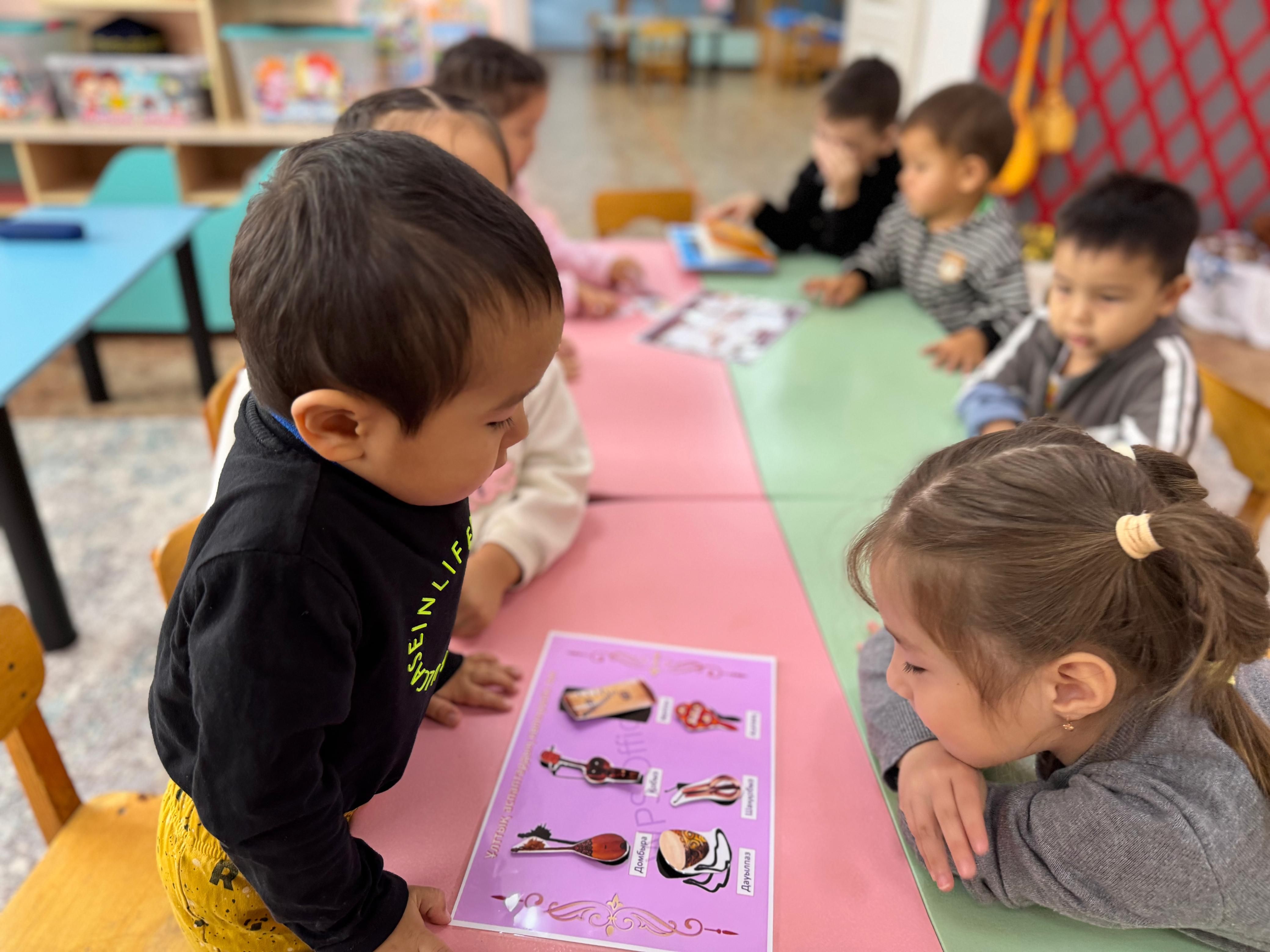 «Тілге бойлау» жобасы барысында шағын орталықтағы балалар ұлттық аспаптармен танысып, олардың ерекшеліктері мен дыбыстарын тыңдау арқылы алғашқы түсінік қалыптастырды