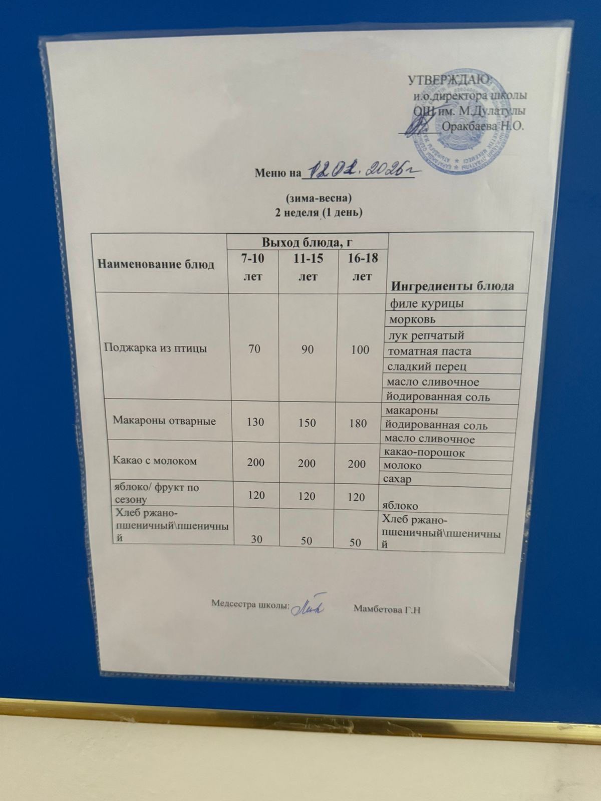 Мектеп оқушыларының тамақтануы туралы ақпарат. 2025 жылдың 12 қаңтар күні мектеп оқушыларына арналған күнделікті тамақтану рационы төмендегідей ұйымдастырылды.