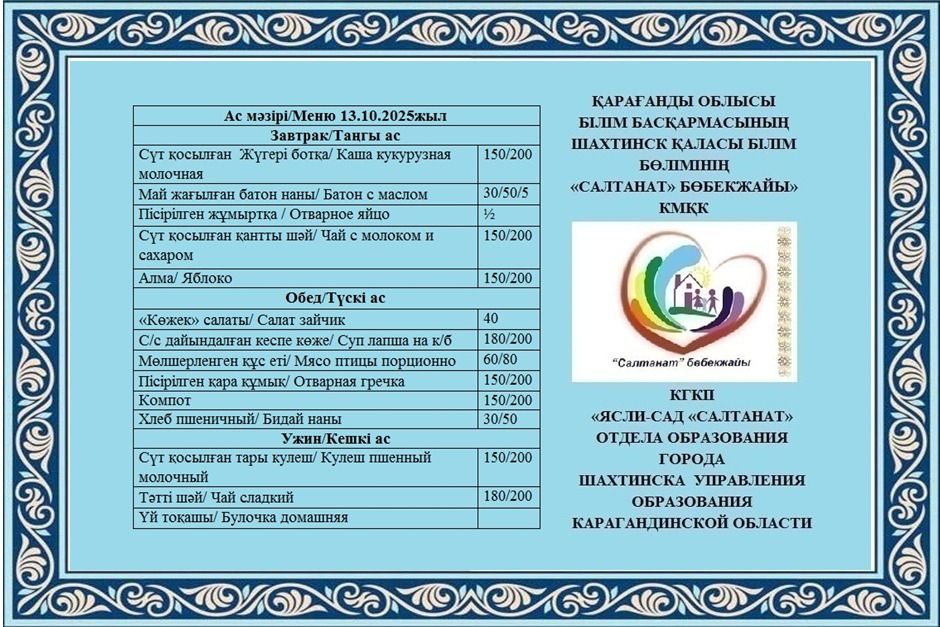 13.10.2025 жылға арналған тамақтану сомасы: 3 жасқа дейінгі бір балаға - 571.51 теңге; 3 жастан 6 жасқа дейінгі бір балаға - 638.22 теңге