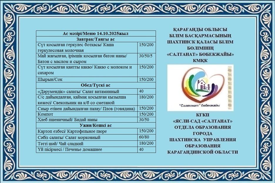 17.10.2025 жылға арналған тамақтану сомасы: 3 жасқа дейінгі бір балаға - 741.87 теңге; 3 жастан 6 жасқа дейінгі бір балаға - 841.92 теңге