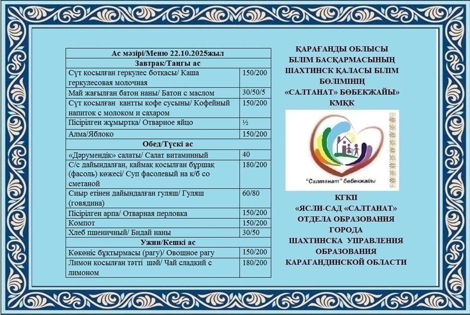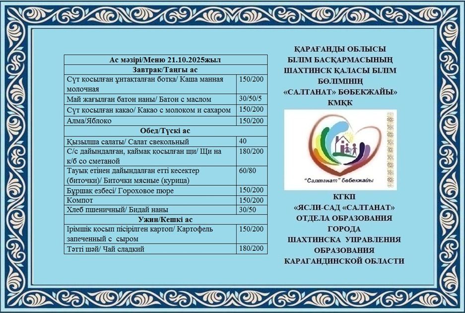 21.10.2025 жылға арналған тамақтану сомасы: 3 жасқа дейінгі бір балаға - 605.76 теңге; 3 жастан 6 жасқа дейінгі бір балаға - 706.32 теңге