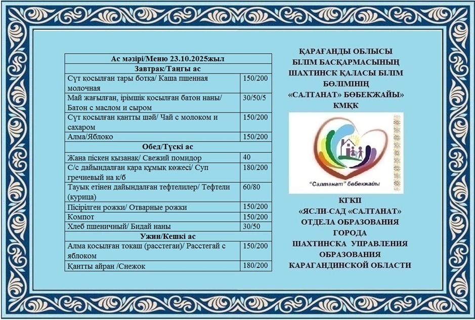 23.10.2025 жылға арналған тамақтану сомасы: 3 жасқа дейінгі бір балаға - 652.31 теңге; 3 жастан 6 жасқа дейінгі бір балаға - 729.53 теңге