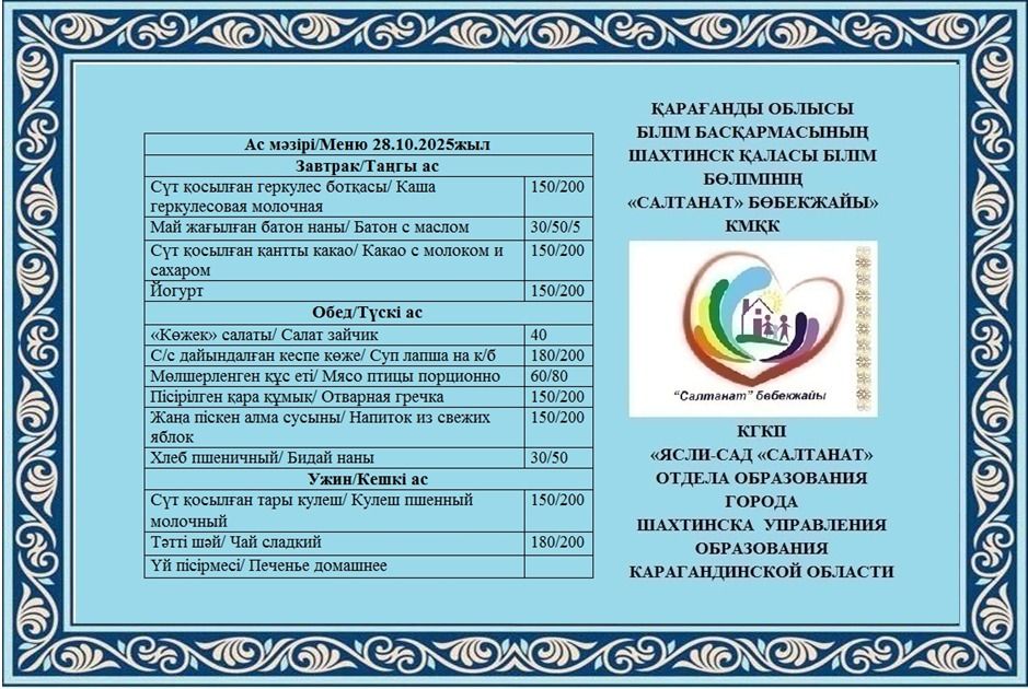 28.10.2025 жылға арналған тамақтану сомасы: 3 жасқа дейінгі бір балаға - 706.79 теңге; 3 жастан 6 жасқа дейінгі бір балаға - 793.40 теңге