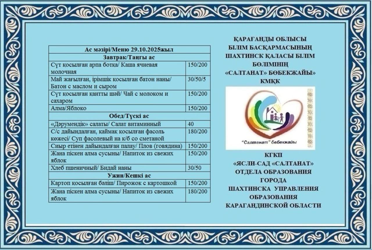 29.10.2025 жылға арналған тамақтану сомасы: 3 жасқа дейінгі бір балаға - 709.98 теңге; 3 жастан 6 жасқа дейінгі бір балаға - 817.51 теңге