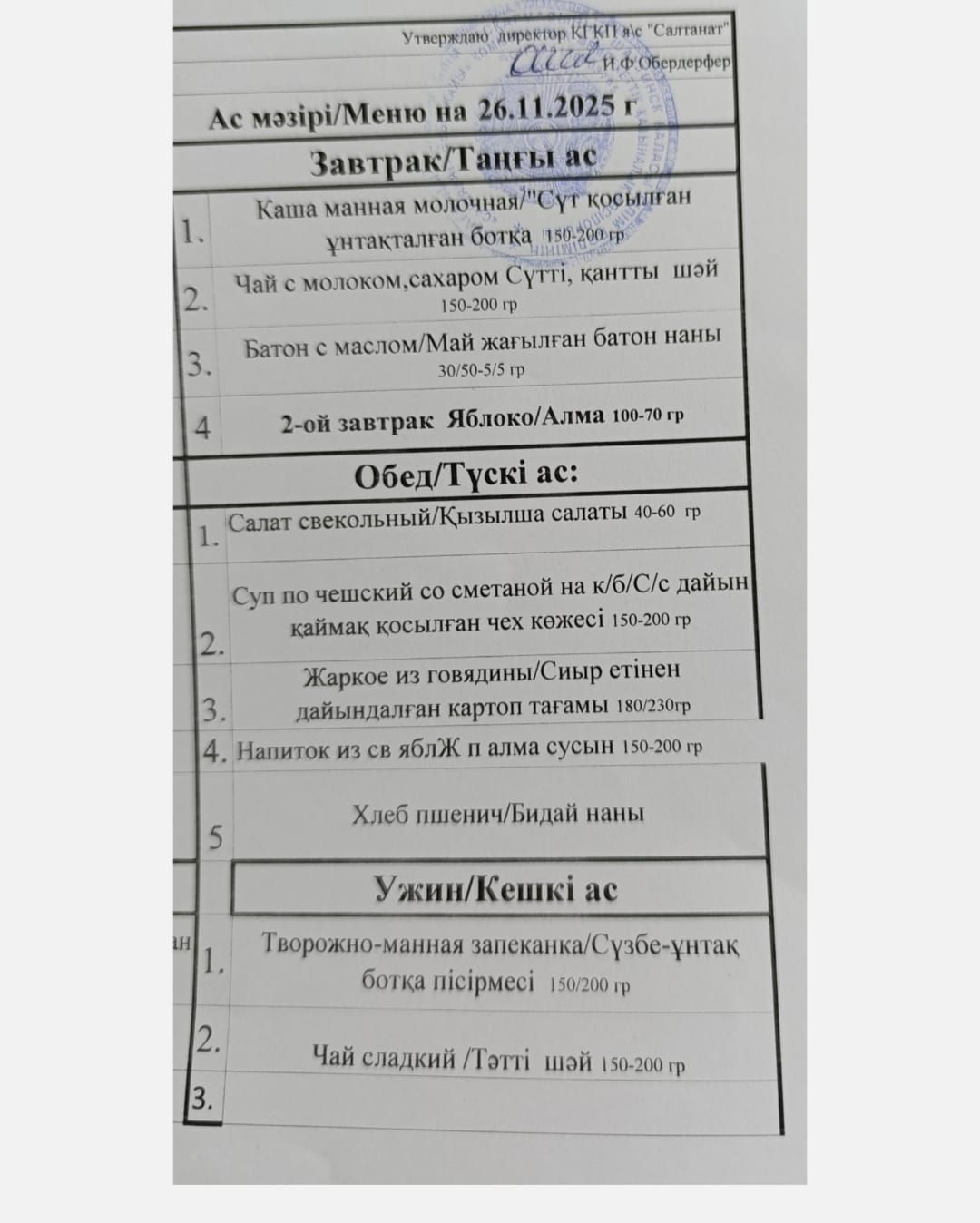 26.11.2025 жылға арналған тамақтану сомасы: 3 жасқа дейінгі бір балаға - 1017.53 теңге; 3 жастан 6 жасқа дейінгі бір балаға - 1265.78 теңге