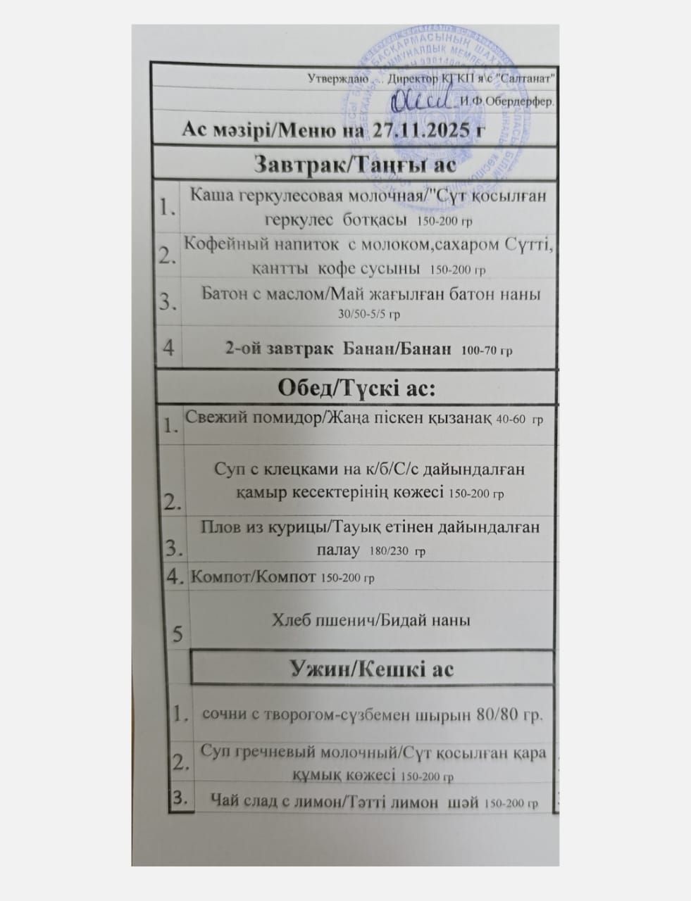 27.11.2025 жылға арналған тамақтану сомасы: 3 жасқа дейінгі бір балаға - 1111.73 теңге; 3 жастан 6 жасқа дейінгі бір балаға - 1162.42 теңге