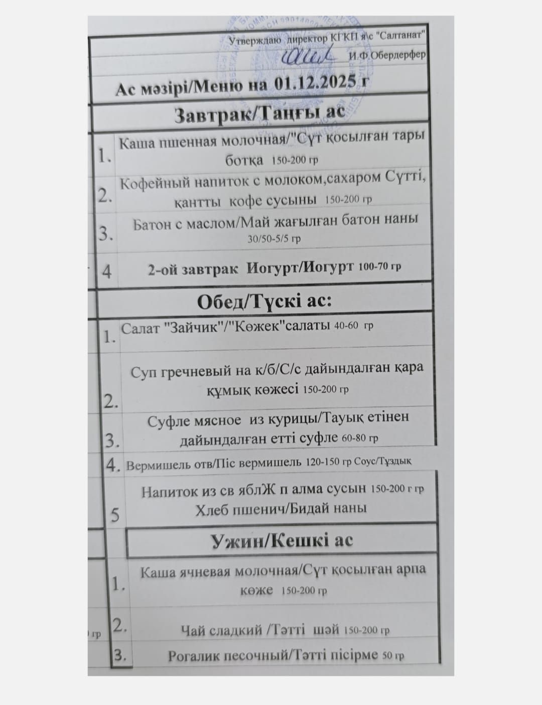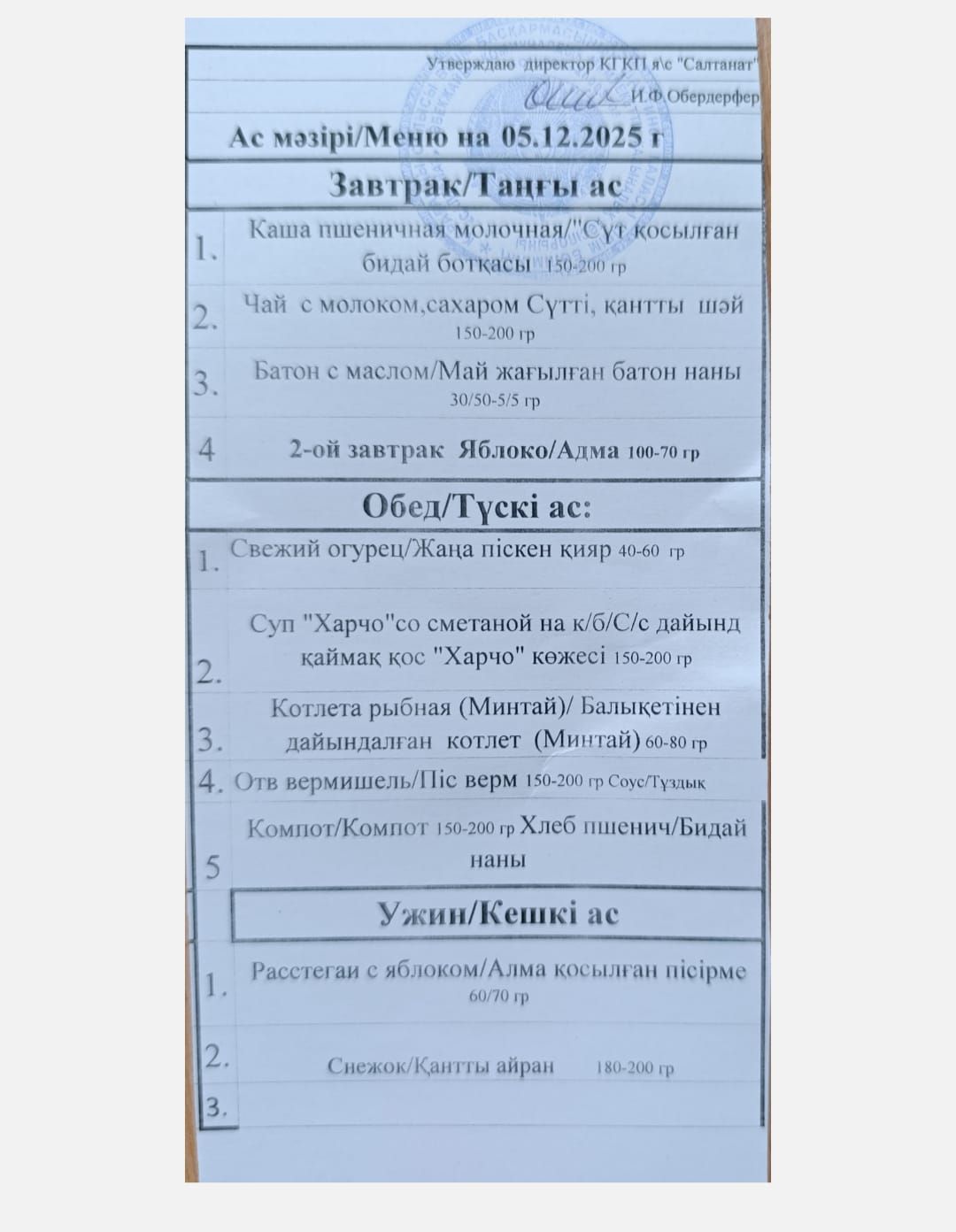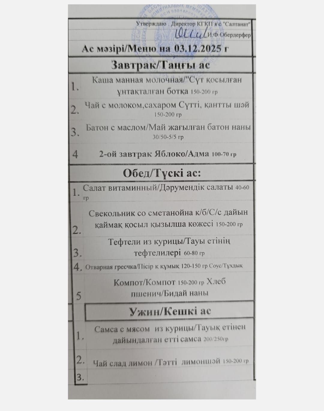 04.12.2025 жылға арналған тамақтану сомасы: 3 жасқа дейінгі бір балаға - 964.72 теңге; 3 жастан 6 жасқа дейінгі бір балаға - 1091.54 теңге