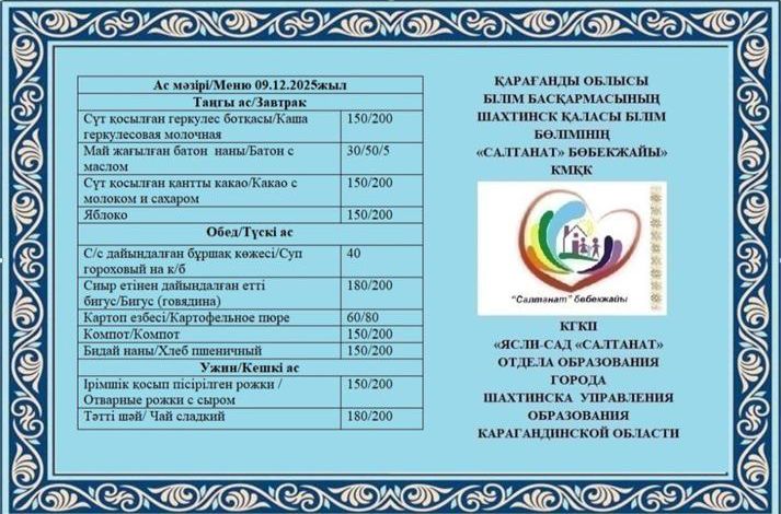 08.12.2025 жылға арналған тамақтану сомасы: 3 жасқа дейінгі бір балаға - 478.25 теңге; 3 жастан 6 жасқа дейінгі бір балаға - 531.32 теңге