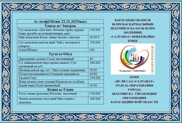 22.12.2025 жылға арналған тамақтану сомасы: 3 жасқа дейінгі бір балаға - 516.69 теңге; 3 жастан 6 жасқа дейінгі бір балаға - 574.25 теңге