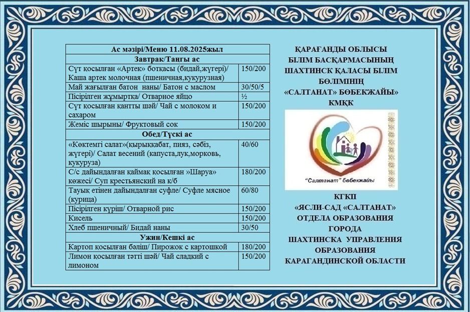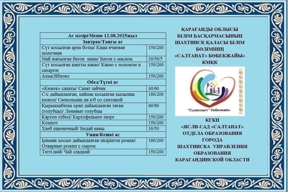 Сумма питания на 12.06.2025 составляет: на одного ребёнка до 3 лет - 689.24 тенге; на одного ребенка с 3 до 6 лет - 758.46 тенге
