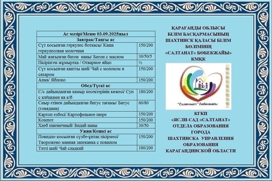 Сумма питания на 03.09.2025 составляет: на одного ребёнка до 3 лет - 881.88 тенге; на одного ребенка с 3 до 6 лет - 1235 тенге