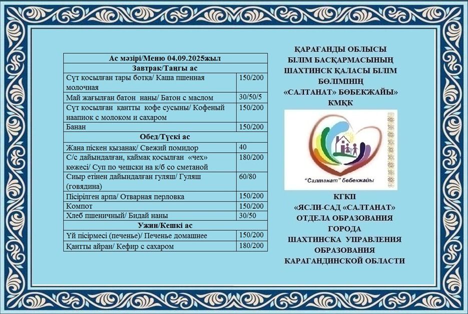 Сумма питания на 04.09.2025 составляет: на одного ребёнка до 3 лет - 856.53 тенге; на одного ребенка с 3 до 6 лет - 940.14 тенге