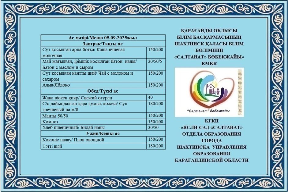 Сумма питания на 05.09.2025 составляет: на одного ребёнка до 3 лет - 618.99 тенге; на одного ребенка с 3 до 6 лет - 706.64 тенге
