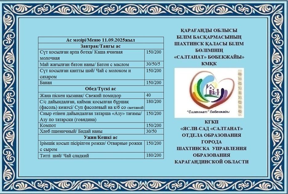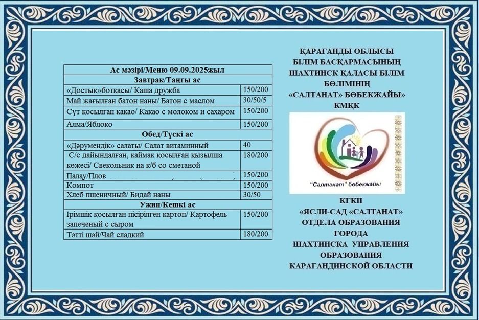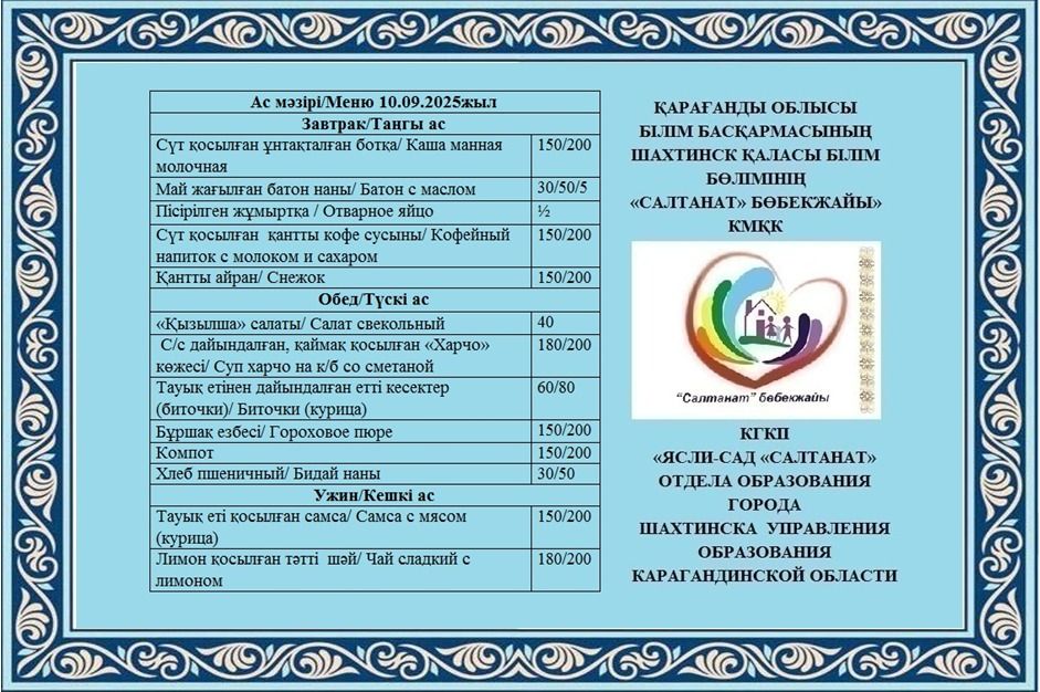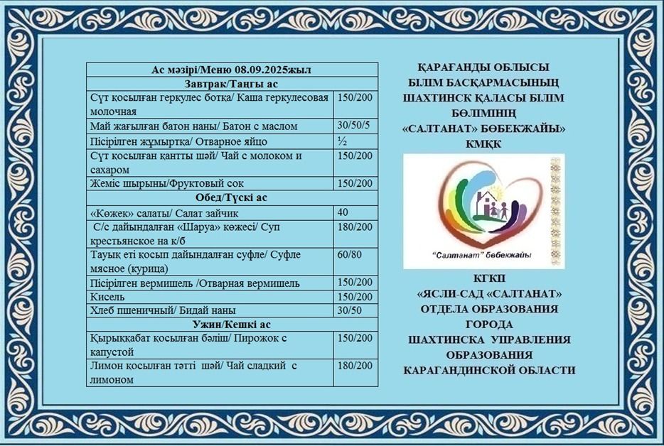 Сумма питания на 08.09.2025 составляет: на одного ребёнка до 3 лет - 550.92 тенге; на одного ребенка с 3 до 6 лет - 621.04 тенге