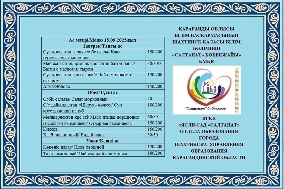 Сумма питания на 15.09.2025 составляет: на одного ребёнка до 3 лет - 527.12 тенге; на одного ребенка с 3 до 6 лет - 611.23 тенге