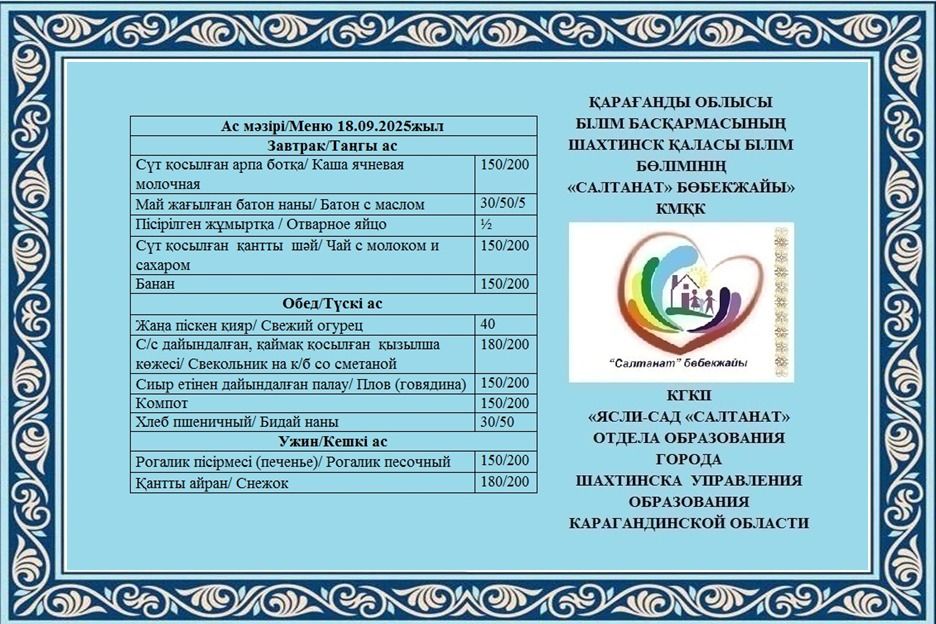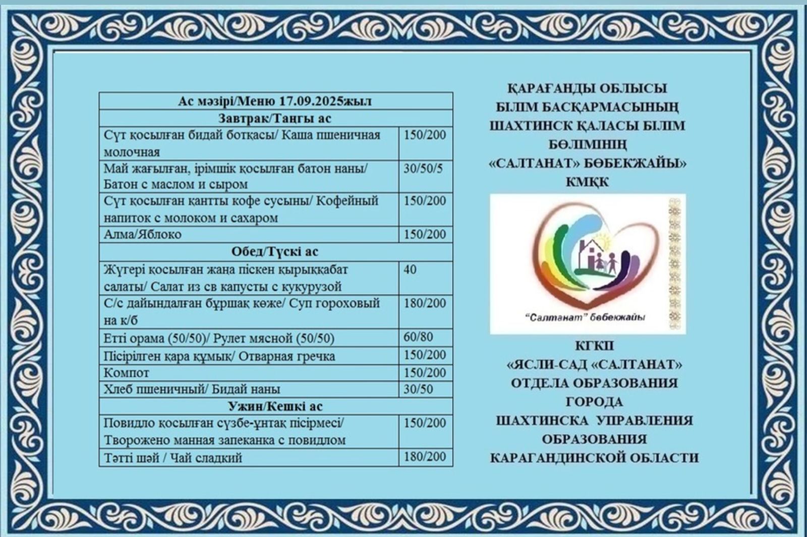 Сумма питания на 18.09.2025 составляет: на одного ребёнка до 3 лет - 997.26 тенге; на одного ребенка с 3 до 6 лет - 1037 тенге