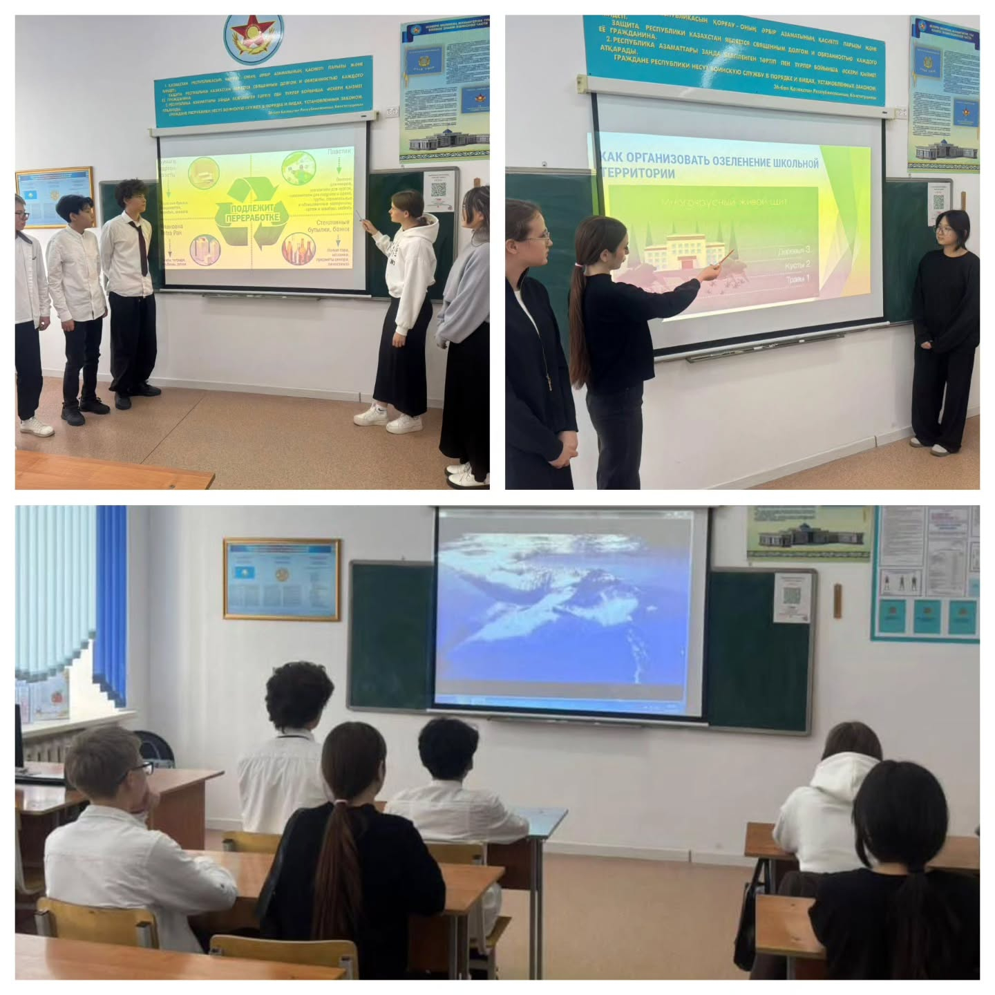 Живой отклик вызвал просмотра короткого видеоролика о глобальных экологических проблемах — ребята поделились своими впечатлениями, выразили тревогу и желание что-то изменить. В форме диалога обучающиеся обсуждали, какие экологические угрозы наиболее актуальны сегодня, и как они сказываются на жизни людей. На практике ребята выступили в роли эко-активистов: в группах разрабатывали собственные экологические проекты, которые можно реализовать в школе и в нашей стране. Предлагались креативные идеи по озеленению территории, сокращению использования пластика и проведению экологических уроков для младших школьников.