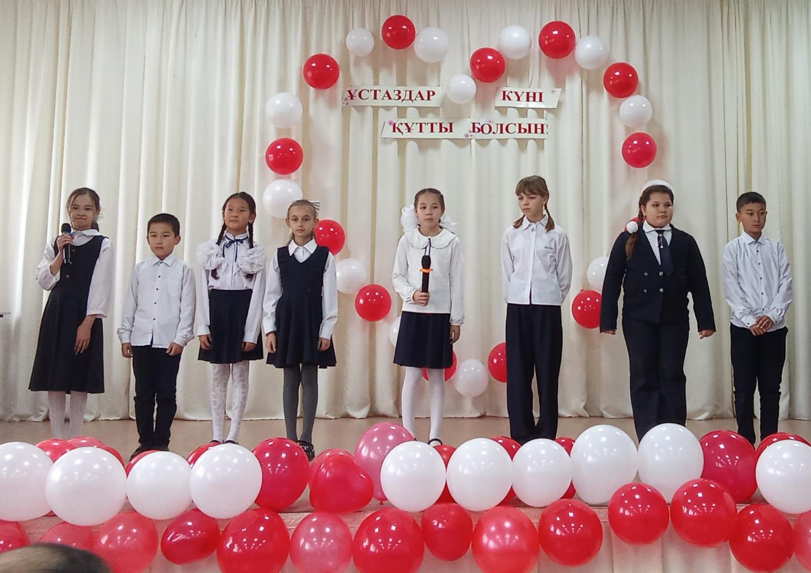 Мерекелік концертте мектеп оқушылары ән шырқап, би билеп, ұстаздарына деген алғысын өнер арқылы жеткізді.