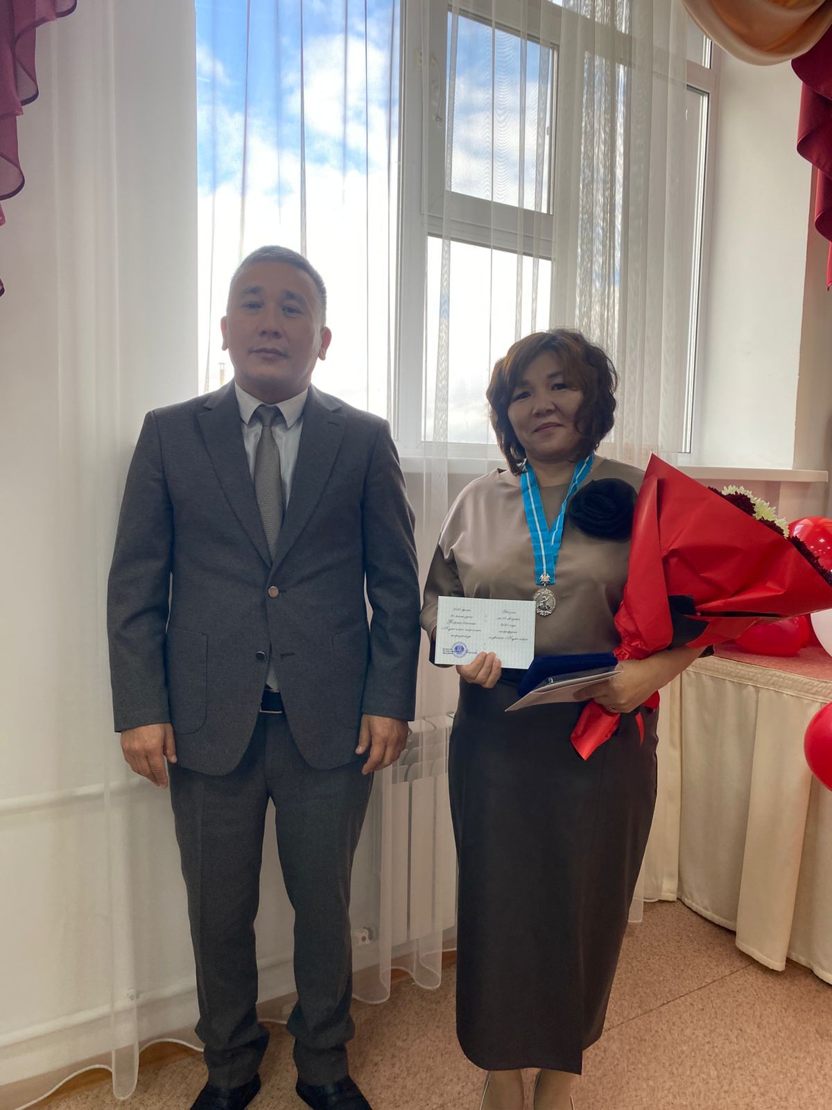 Жолдыбаева А.Ж. награждена медалью «Кумыс алка» как многодетная мать — награду вручил аким Дубовского сельского округа Кисраунов Е.Д.