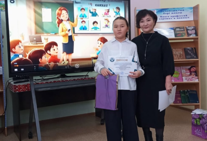 «Оқушылардың кәсіби бағдарын айқындауға медиа сауаттылығын арттыруға бағытталған заманауи цифрлық құралдарды шығармашылық тұрғыда пайдалану мақсатында ұйымдастырылған “Менің болашақ мамандығым” аудандық медиа байқауына қатысып “Цифрлық постер” номинация бойынша ІІІ орын иеленгені үшін М.Жұмабаев атындағы мектеп-гимназиясы 5 сынып оқушысы Қадырбай Томирис марапатталды!»