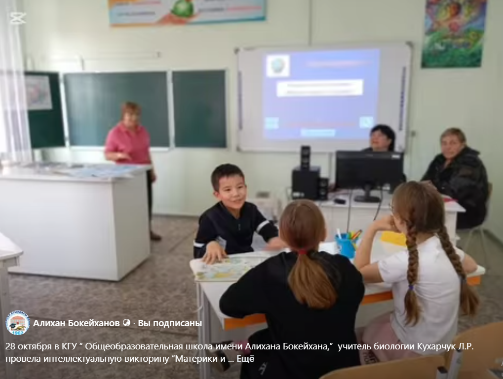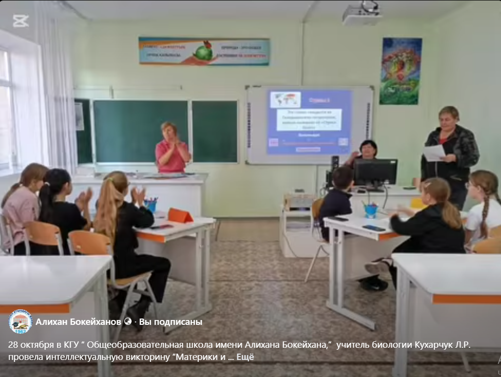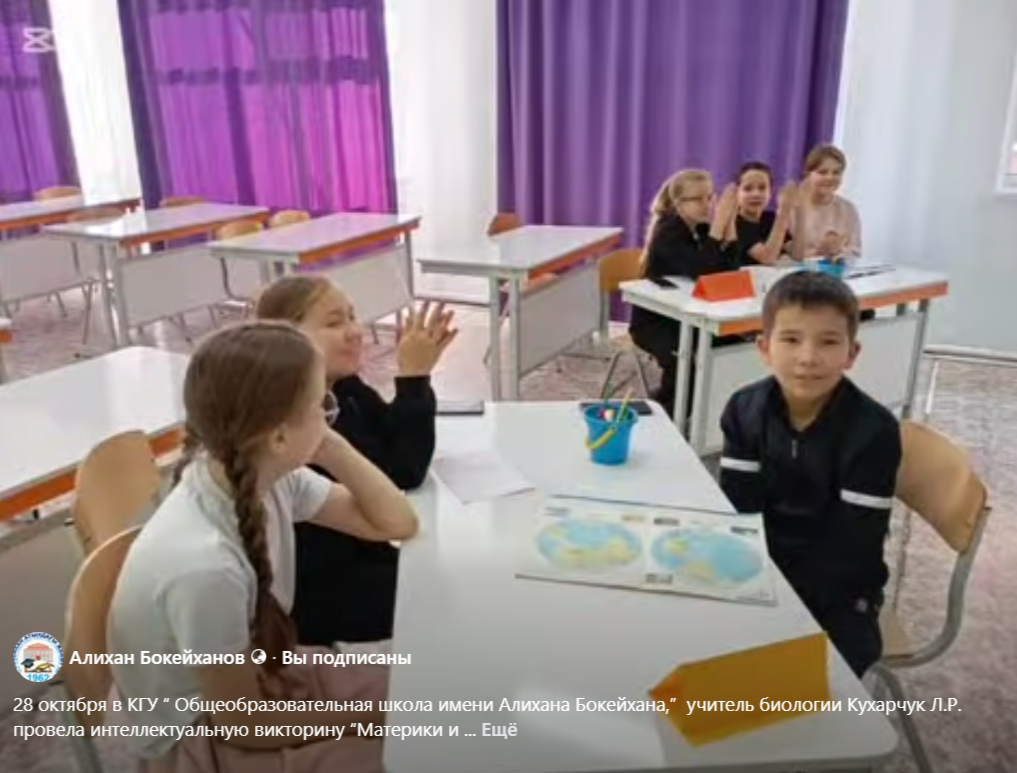 28 октября в КГУ “ Общеобразовательная школа имени Алихана Бокейхана,” учитель биологии Кухарчук Л.Р. провела интеллектуальную викторину “Материки и океаны”, среди учащихся 5,6 классов.