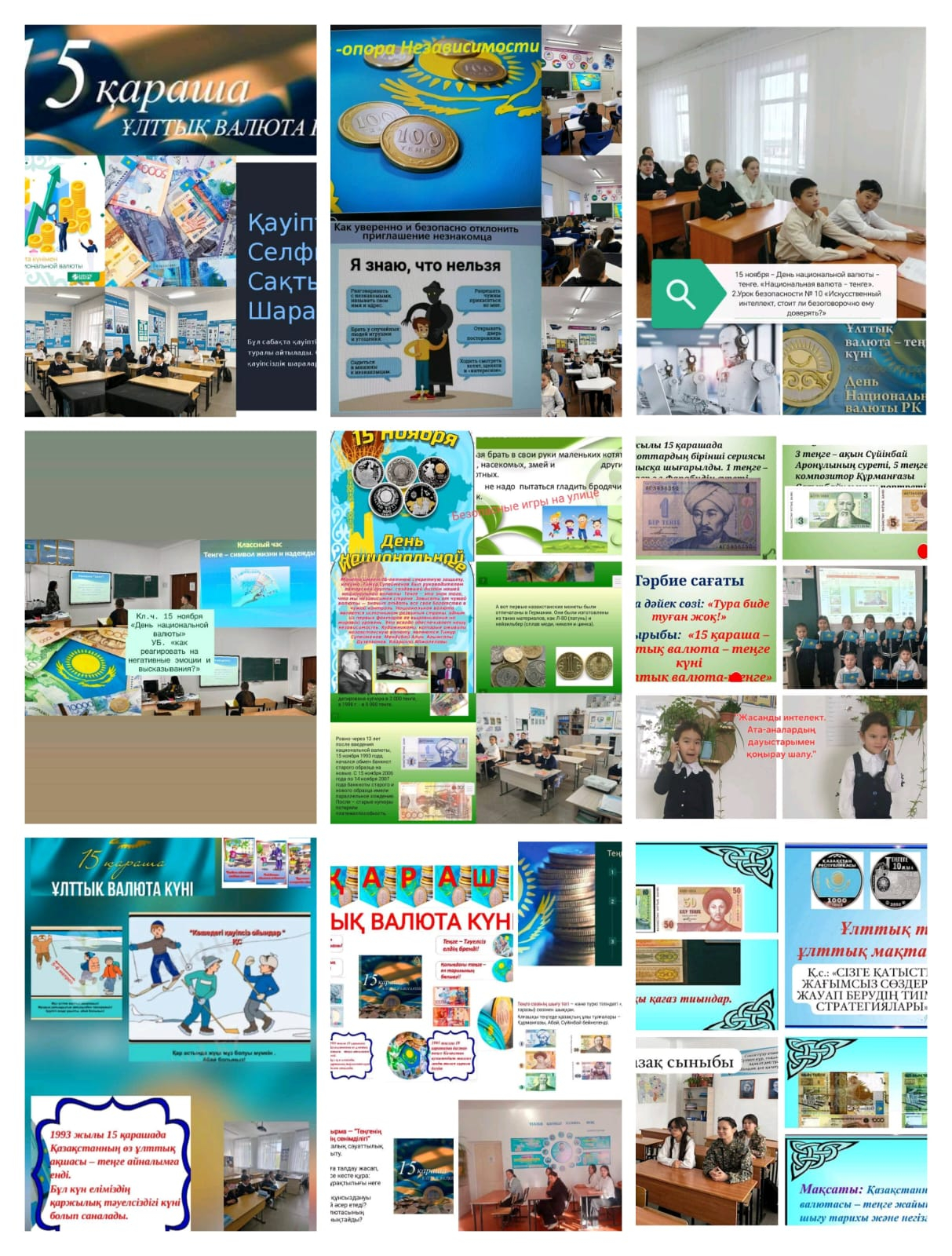 "Адал азамат" біртұтас тәрбие бағдарламасының жоспарына сәйкес "15 қазан ұлттық валюта күні" атты тақырыпта барлық сыныптарда сынып сағаты және қауіпсіздік сабағы өткізілді.