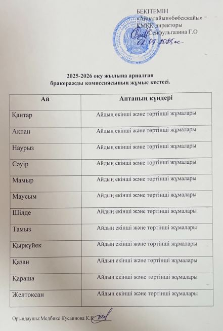 2025-2026 оқу жылына арналған бракеражды комиссияның жұмыс кестесі