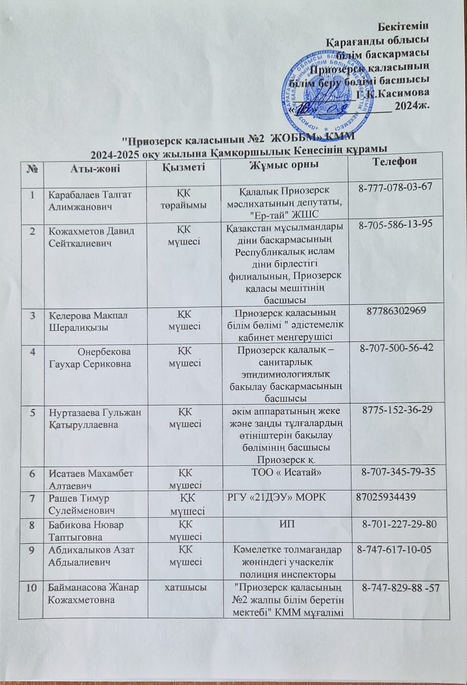 Қамқоршылық Кеңесінің құрамы"Приозерск қаласының №2 ЖББМ" 2024-2025 оқу жылына
