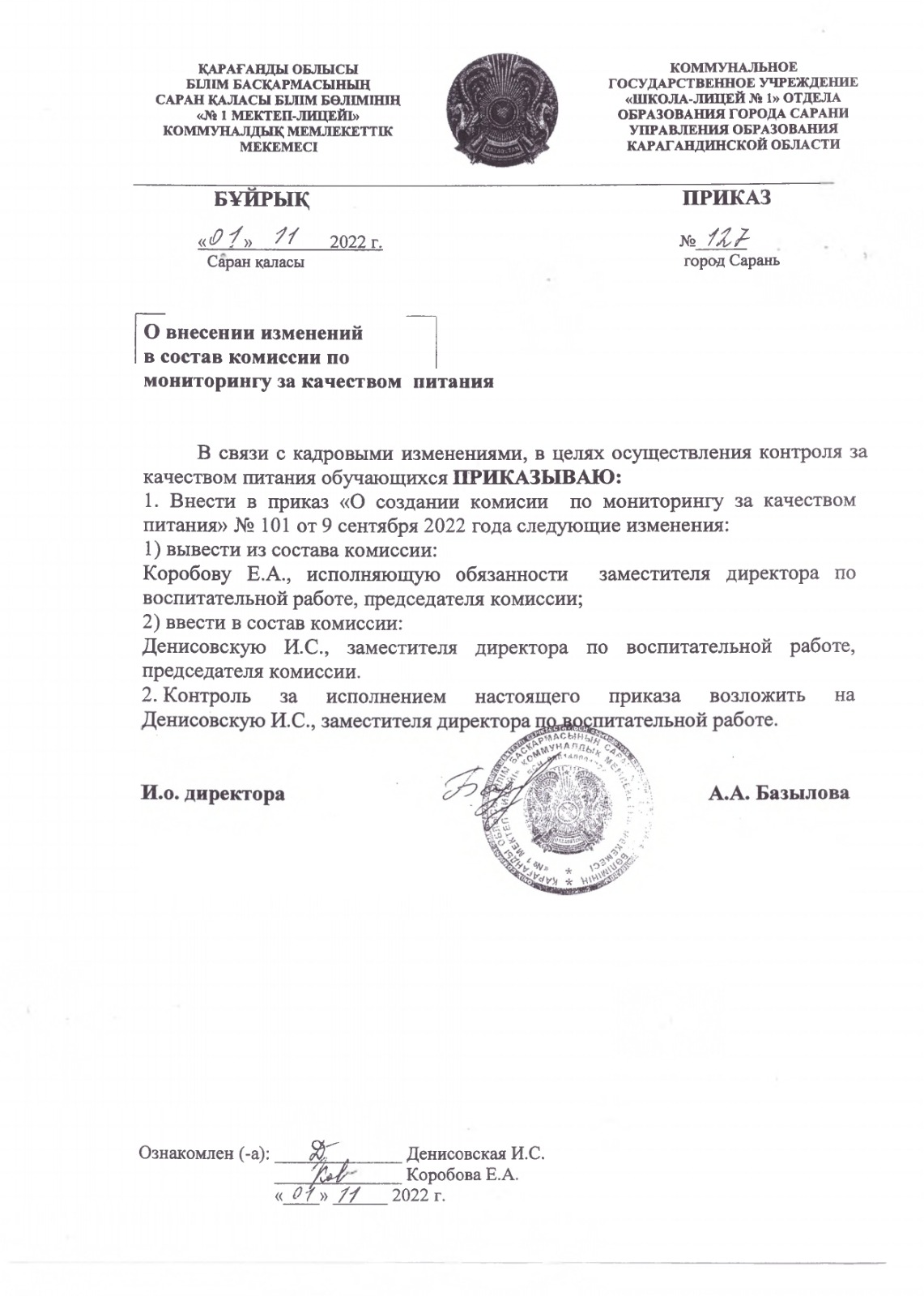 О внесении изменений в состав комиссии по мониторингу за качеством питания
