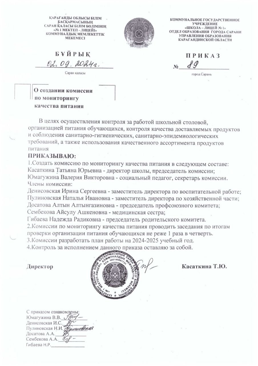 О создании комиссии по мониторингу качества питания№89 от 02.09.2024 |