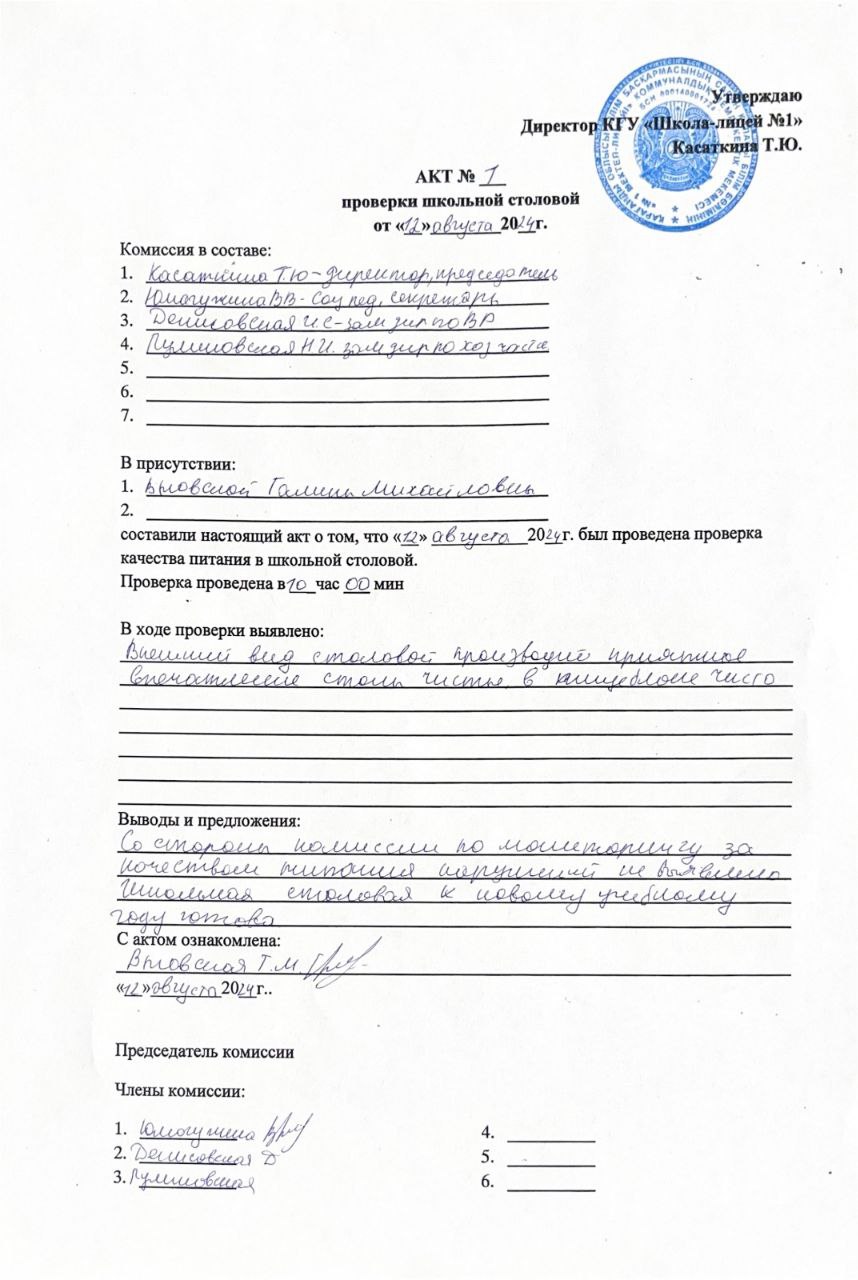 Акт №1 проверки школьной столовойот 12.08.2024 г. |