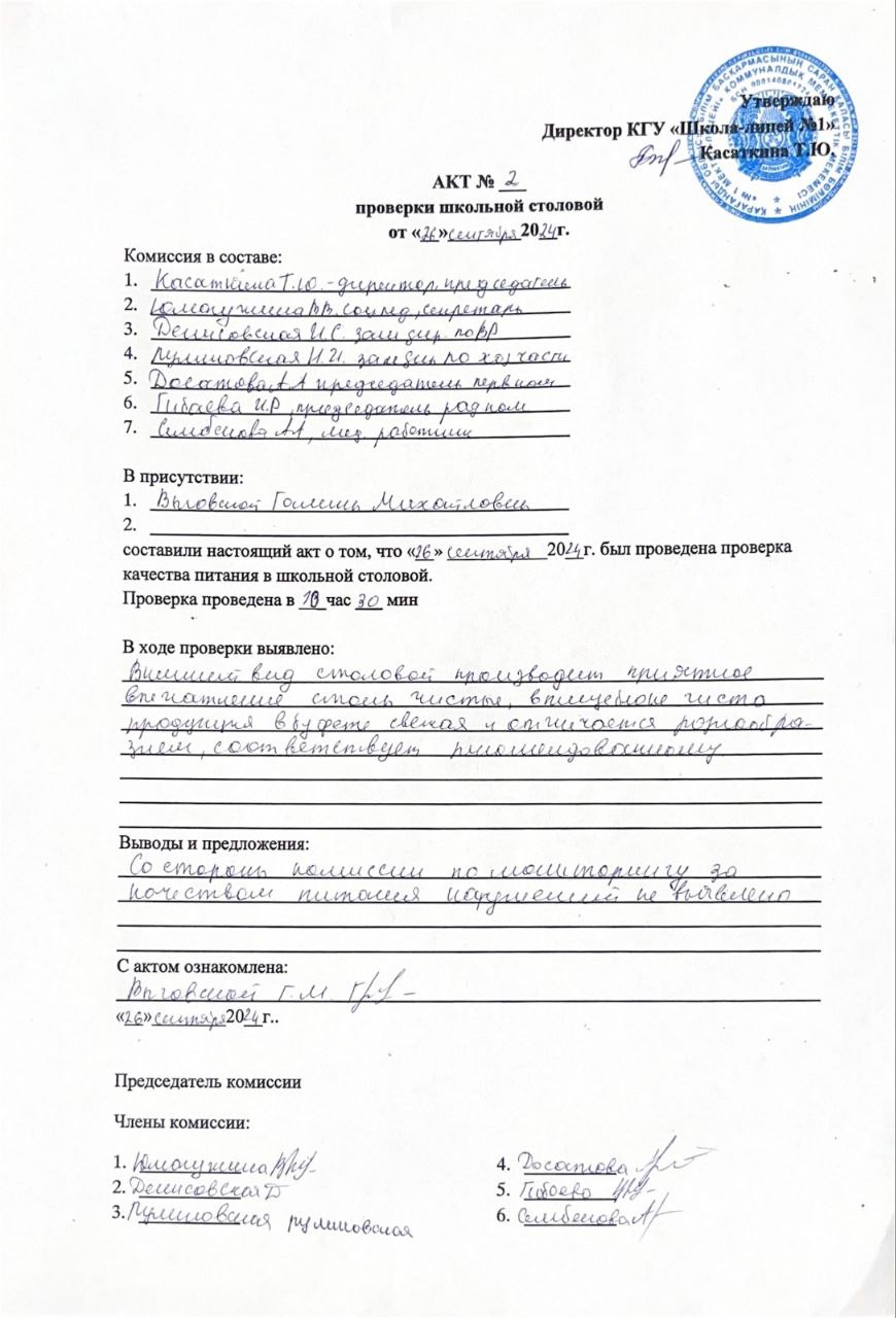 Акт "2 проверки школьной столовойот 26.09.2024 г. |
