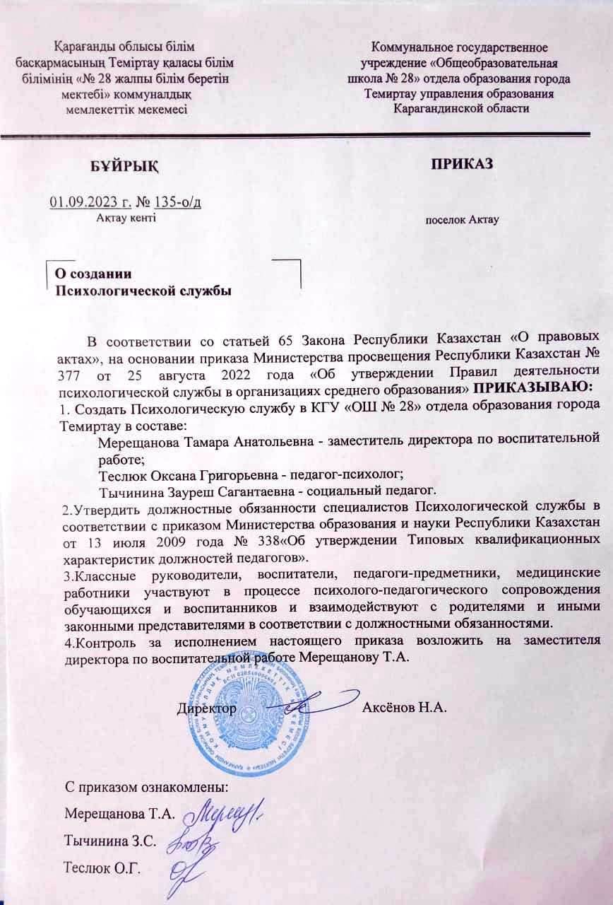 Приказ о создании Психологической службы