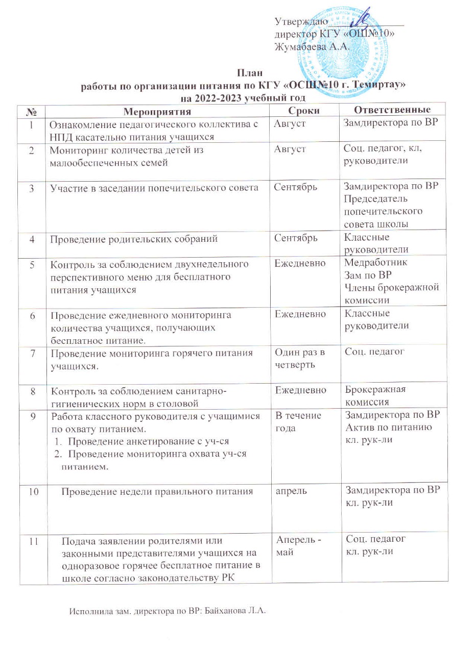 План работы по организации школьного питания