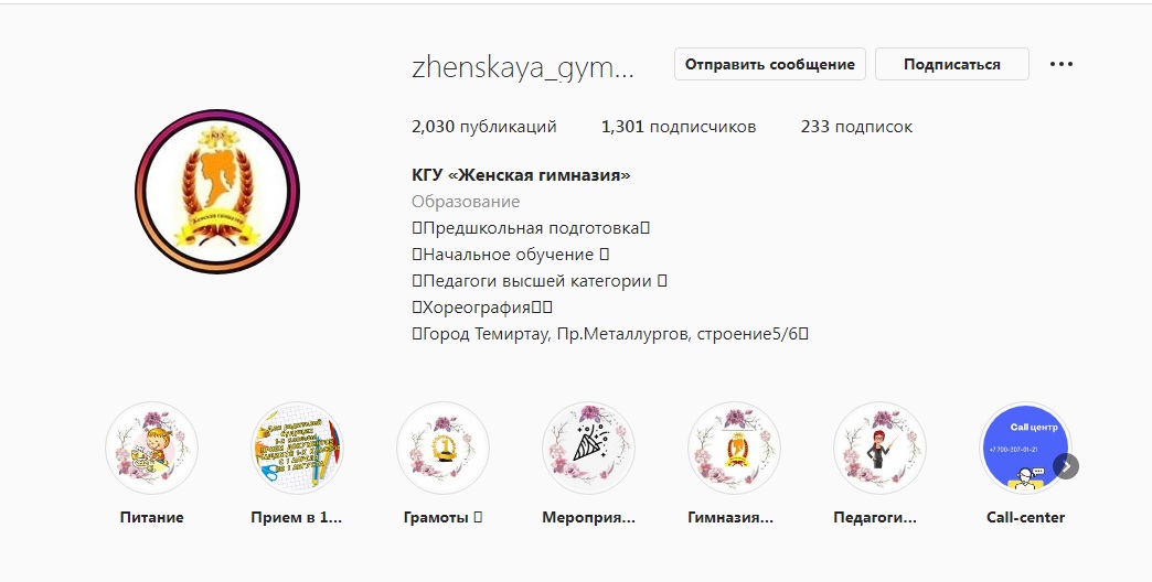 Инстаграм желісінің сілтемесі:https://www.instagram.com/zhenskaya_gymnasia_/ |