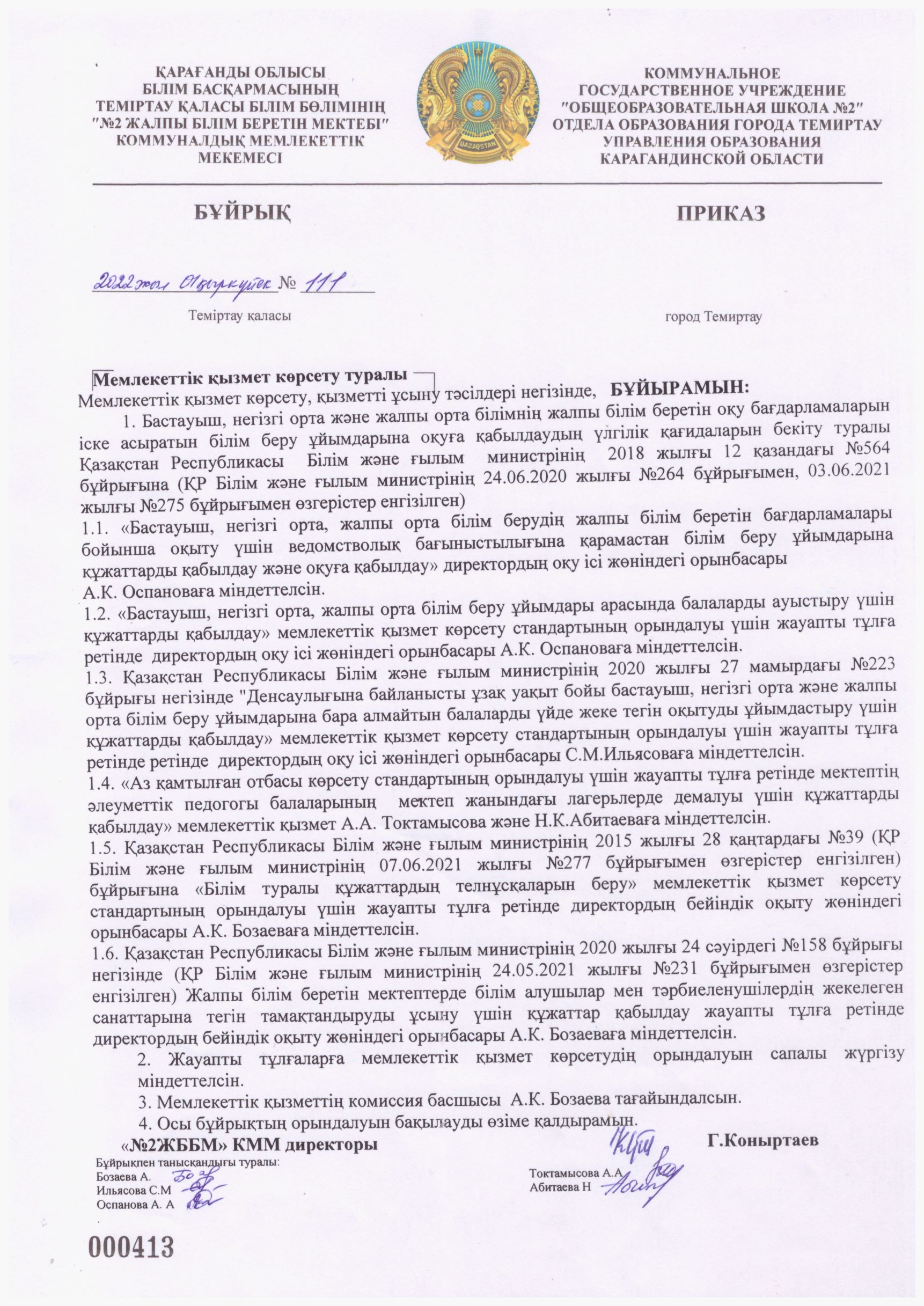 Мемлекеттік қызмект көрсету бұйрығы2023-2024 оқу жылына арналған мемлекеттік қызмет көрсету бойынша бұйрық. Жауапты тұлғаларға міндеттерді жүктеу. |