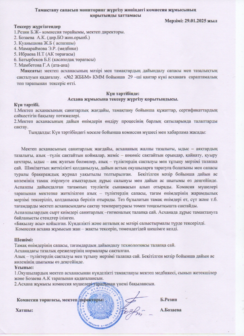 Тамақтану сапасын бақылау жөніндегі ведомствоаралық сараптау тобының актісіТамақтану сапасын бақылау жөніндегі ведомствоаралық сараптау тобының актісі |