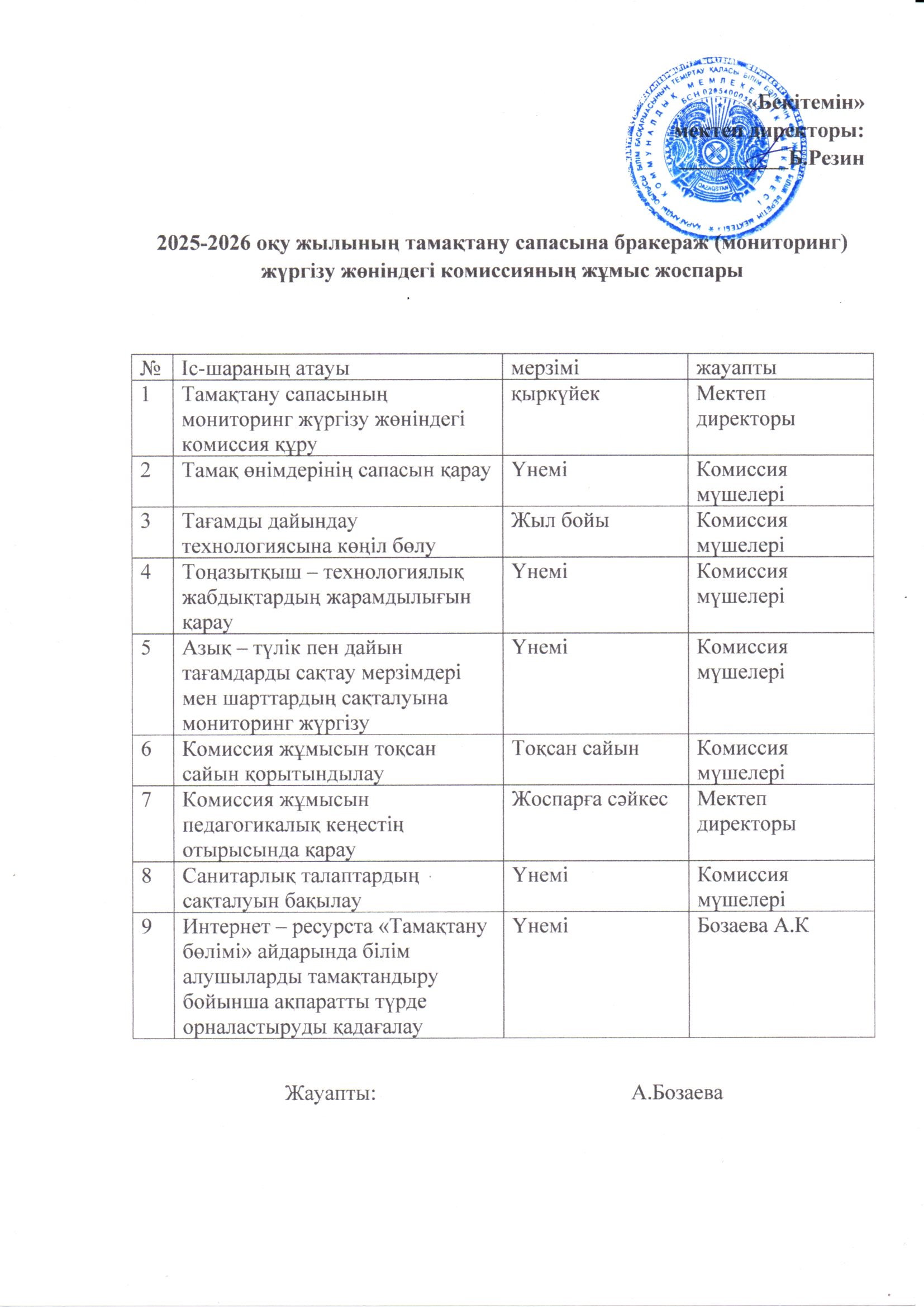Бракераж жоспары2025-2026 оқу жылының тамақтану сапасына бракераж (мониторинг) жүргізу жөніндегі комиссияның жұмыс жоспары |