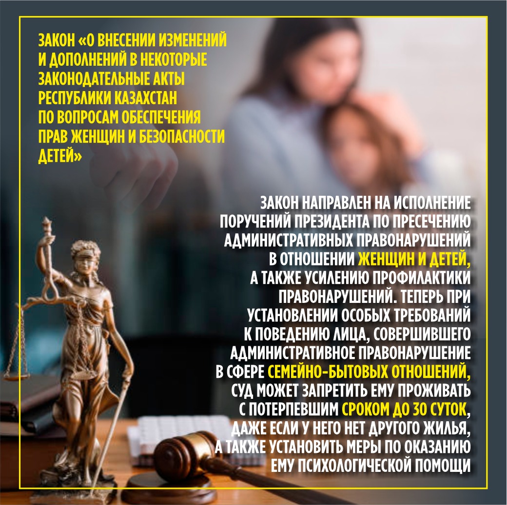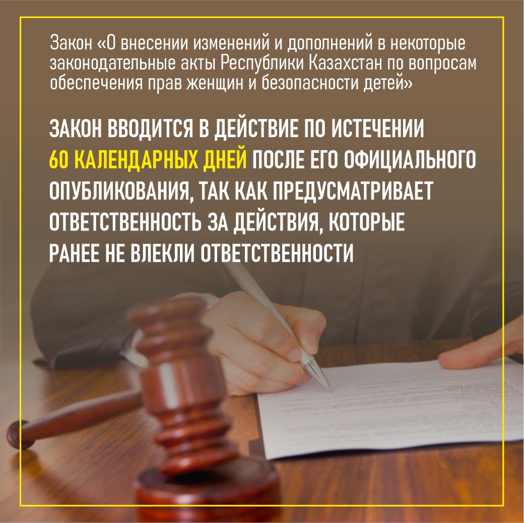«О внесении изменений и дополнений в некоторые законодательные акты Республики Казахстан по вопросам обеспечения прав женщин и безопасности детей» |