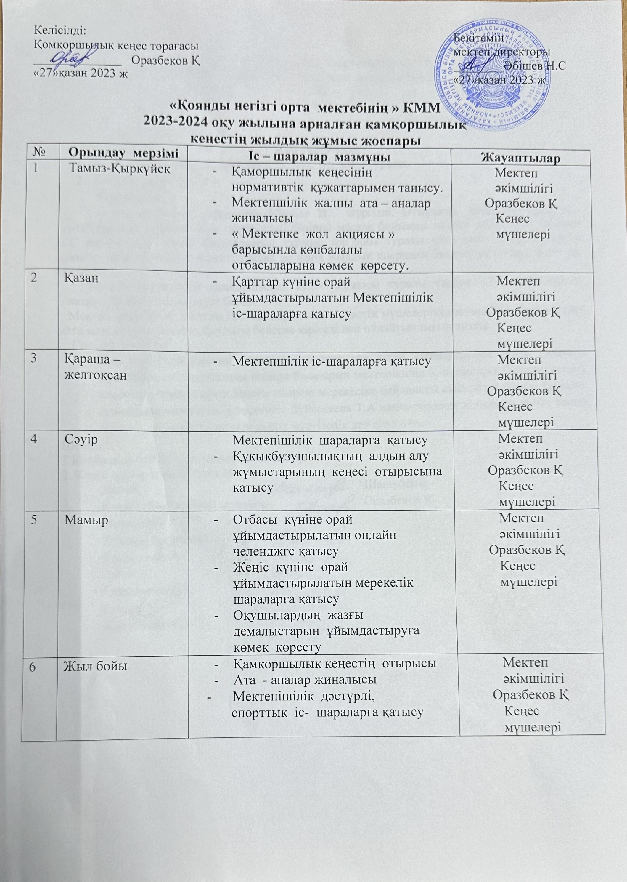 Қамқорлық кеңесі жылдық жоспары