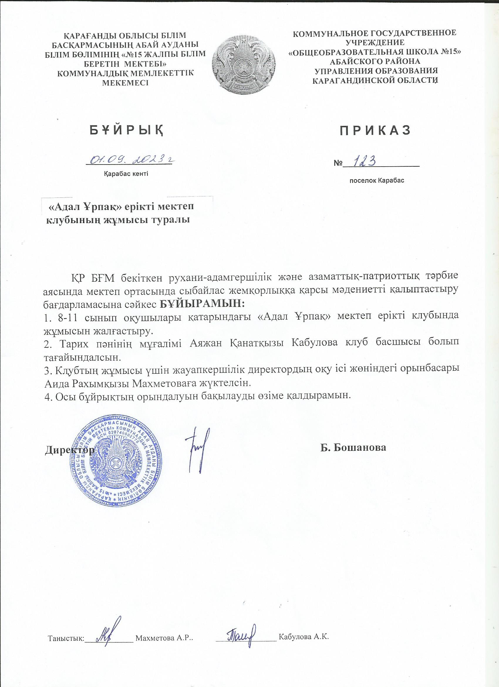 Бұйрық "ЖББМ №15" 01.09.2023 жыл"Адал Ұрпақ" ерікті мектеп клубының жұмысы туралы |