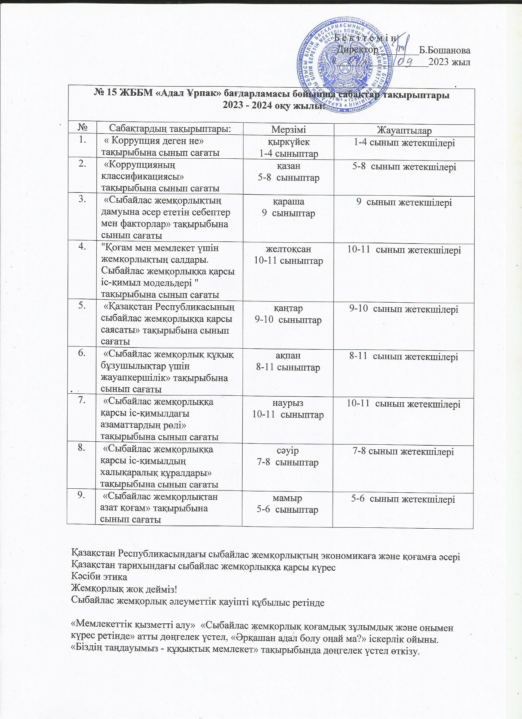 КГУ ОШ №15 Темы занятий "Адал Ұрпақ" на 2023-2024 учебный годТемы занятий по программе "Адал Ұрпақ" в КГУ ОШ №15 на 2023-2024 учебный год. |